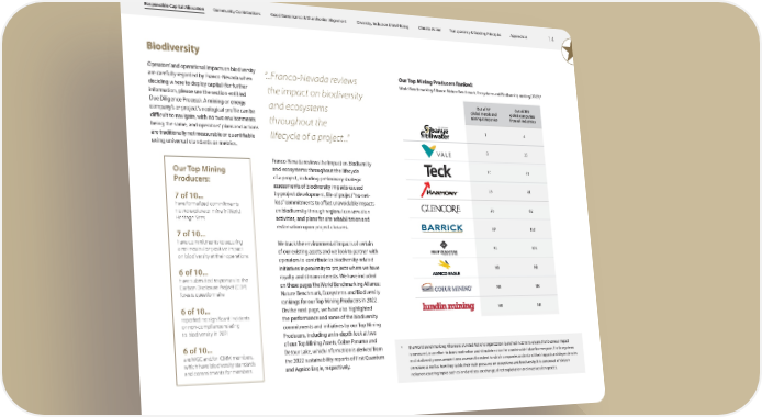 1 4 Appendices Transparency & Guiding Principles Climate Action Diversity, Inclusion & Well-Being Good Governance & Shareholder Alignment Community Contributions Responsible Capital Allocation Operators’ and operational impacts on biodiversity are carefully regarded by Franco-Nevada when deciding where to deploy capital (for further information, please see the section entitled Due Diligence Process). A mining or energy company’s or project’s ecological profile can be difficult to navigate, with no two environments being the same, and operators’ plans and actions are traditionally not measurable or quantifiable using universal standards or metrics. Franco-Nevada reviews the impact on biodiversity and ecosystems throughout the lifecycle of a project, including preliminary strategic assessments of biodiversity impacts caused by project development, life of project “no-net- loss” commitments to offset unavoidable impacts on biodiversity through regional conservation activities, and plans for site rehabilitation and reclamation upon project closures. We track the environmental impacts of certain of our existing assets and we look to partner with operators to contribute to biodiversity-related initiatives in proximity to projects where we have royalty and stream interests. We have included on these pages the World Benchmarking Alliance: Nature Benchmark, Ecosystems and Biodiversity rankings for our Top Mining Producers in 2022. On the next page, we have also highlighted the performance and some of the biodiversity commitments and initiatives by our Top Mining Producers, including an in-depth look at two of our Top Mining Assets, Cobre Panama and Detour Lake, which information is derived from the 2022 sustainability reports of First Quantum and Agnico Eagle, respectively. Our Top Mining Producers: 7 of 10... have formalized commitments not to explore or mine in World Heritage Sites 7 of 10... have commitments to securing a net neutral or positive impact on biodiversity at their operations 6 of 10... have submitted responses to the Carbon Disclosure Project (CDP) forests questionnaire 6 of 10... reported no significant incidents or non-compliance relating to biodiversity in 2021 6 of 10... are WGC and/or ICMM members, which have biodiversity standards and commitments for members “...Franco-Nevada reviews the impact on biodiversity and ecosystems throughout the lifecycle of a project...” Biodiversity Our Top Mining Producers Ranked: World Benchmarking Alliance: Nature Benchmark, Ecosystems and Biodiversity ranking (2022)* Out of 97 global metals and mining companies Out of 389 global companies from all industries 1 4 8 25 17 51 25 81 26 82 39 132 54 198 NR NR NR NR NR NR * The World Benchmarking Alliance is a United Nations organization launched in 2018 to ensure that business impact is measured, in an effort to boost motivation and stimulate action for a sustainable future for everyone. The Ecosystems and biodiversity measurement area assesses the extent to which companies understand their impacts and dependencies on nature as well as how they tackle their main pressures on ecosystems and biodiversity. It is composed of sixteen indicators covering topics such as land and sea use change, direct exploitation and invasive alien species.