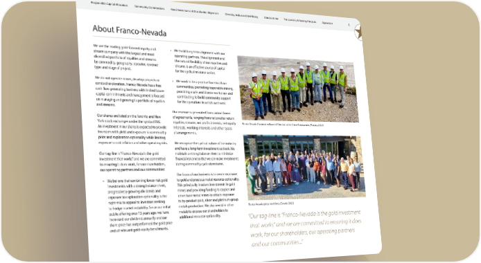 4 Appendices Transparency & Guiding Principles Climate Action Diversity, Inclusion & Well-Being Good Governance & Shareholder Alignment Community Contributions Responsible Capital Allocation About Franco-Nevada We are the leading gold-focused royalty and stream company with the largest and most diversified portfolio of royalties and streams by commodity, geography, operator, revenue type and stage of project. We do not operate mines, develop projects or conduct exploration. Franco-Nevada has a free cash flow generating business with limited future capital commitments and management is focused on managing and growing its portfolio of royalties and streams. Our shares are listed on the Toronto and New York stock exchanges under the symbol FNV. An investment in our shares is expected to provide investors with yield and exposure to commodity price and exploration optionality while limiting exposure to cost inflation and other operating risks. Our tag-line is “Franco-Nevada is the gold investment that works” and we are committed to ensuring it does work, for our shareholders, our operating partners and our communities: • We believe that combining lower-risk gold investments with a strong balance sheet, progressively growing dividends and exposure to exploration optionality is the right mix to appeal to investors seeking to hedge market instability. Since our initial public offering over 15 years ago, we have increased our dividend annually and our share price has outperformed the gold price and all relevant gold equity benchmarks. • We build long-term alignment with our operating partners. This alignment and the natural flexibility of our royalties and streams is an effective source of capital for the cyclical resource sector. • We work to be a positive force in all our communities, promoting responsible mining, providing a safe and diverse workplace and contributing to build community support for the operations in which we invest. Our revenue is generated from various forms of agreements, ranging from net smelter return royalties, streams, net profits interests, net royalty interests, working interests and other types of arrangements. We recognize the cyclical nature of the industry and have a long-term investment outlook. We maintain a strong balance sheet to minimize financial risk and so that we can make investments during commodity cycle downturns. The focus of our business is to create exposure to gold and precious metal resource optionality. This principally involves investments in gold mines and providing funding to copper and other base metal mines to obtain exposure to by-product gold, silver and platinum group metals production. We also invest in other metals to expose our shareholders to additional resource optionality. Franco-Nevada Corporation Board of Directors at the Cobre Panama mine, Panama (2022) Franco-Nevada global workforce, Canada (2022) “Our tag-line is “Franco-Nevada is the gold investment that works” and we are committed to ensuring it does work, for our shareholders, our operating partners and our communities...”