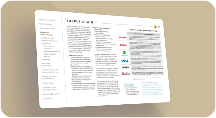 17 Message from our CEO Report Highlights About Franco-Nevada Responsible Capital Allocation Due Diligence Process Ongoing Asset Management Key ESG Factors Health and Safety Carbon Footprint Water Management and Risk Tailings Management Biodiversity Supply Chain Community Contributions Good Governance and Shareholder Alignment Diversity, Inclusion and Well-Being Climate Action Transparency and Guiding Principles About this ESG Report Appendices S U P P L Y C H A I N Significant Providers* of Office Supplies in 2023 ESG Initiatives, Plans, Targets & Commitments • In-store recycling solutions and eco-responsible products and packaging and leveraging Bullfrog Power to help support transition from fossil fuels to renewable energy. • Commitment to reduce operational carbon emissions by 35% and divert 90% of waste from fulfillment centres to recycling by 2028. • Wastepaper packaging and recycling initiative, electronic product stewardship helping to design, promote and implement sustainable solutions for end-of-life electronics, and battery recycling. • Commitment to a sustainable future and environmental conservation by way of The Clean Earth Campaign and the adoption of a corporate environmental charter along with a net zero by 2050 commitment, with goal to reduce absolute Scope 1 and Scope 2 GHG emissions by 42% and absolute Scope 3 GHG emissions (category 1 and 11) 25% by 2030. • Environmental programs to limit waste, conserve energy, promote recycling and minimize use of harmful chemicals, and community initiatives focussed on education, entrepreneurism and strengthening communities. • Various environmental targets, including achieving zero waste in 30% of distribution centres by 2025 and a 46% reduction of absolute Scope 1 and Scope 2 GHG emissions by 2030. • Energy efficiency, cultivating inclusion through an inclusive and diverse workforce, advancing digital inclusion (UNICEF’s Giga initiative), and upholding trust through artificial intelligence practices. • Net zero by 2050 commitment, with a reduction of Scope 1 and Scope 2 GHG emissions by 50% by 2030 and sourcing 100% of electricity from renewable sources across all Dell Technologies facilities by 2040. • Reducing waste and packaging, protecting natural resources, and supporting a responsible and more diverse supply chain. • Net zero by 2040 commitment, with a goal to power all operations with 100% renewable energy by 2025 (five years ahead of 2030 target). • ‘Go Green’ Mandate that provides customers with expanded options in the areas of responsibility, sustainability and minimization of waste, including biodegradable packaging, recycling programs, and certified fair trade and sustainable product offerings. We have a Supplier Code of Conduct, which sets out our expectations for organizations, including their employees and representatives, who supply goods and services to us (collectively, our “Suppliers”). The Supplier Code of Conduct is delivered to Suppliers and we require in our contractual arrangements that they comply with such code of conduct. Although Franco-Nevada has certain suppliers of office supplies for our corporate operations, most of our Suppliers are technical, ESG and other consultants who provide information and advice to our company to support and supplement our due diligence when evaluating royalty and stream opportunities. Suppliers are expected to: • Conduct their business activities in compliance with laws and standards in the jurisdictions in which they operate; • Prevent conflicts of interest with Franco-Nevada; • Employ individuals above the legal age of employment, not to use forced or slave labour, meet minimum wage requirements and not exceed working hour and day regulations; • Recognize freedom of association and the right to collective bargaining; • Refrain from discriminating against their employees; • Respect the dignity of their own employees and others, adhere to principles of diversity and maintain a respectful workplace; and • Afford equality of opportunity to all people. Suppliers are also encouraged to: • Reduce GHGs; • Preserve water and minimize water pollutants; • Maintain soil, biodiversity and ecosystem quality; • Reduce resource waste and foster optimal resource use; • Incorporate climate change risk assessment into their risk management procedures; and • Measure and publicly report on their climate change risk and environmental performance. In addition, in accordance with our Climate Action Policy (described on page 35) , before transacting with any significant provider of goods for our corporate operations, we ensure that such supplier has commitments, plans, targets and initiatives aligned with net-zero emissions by 2050 or sooner. Failure of any of our Suppliers to comply with our Supplier Code of Conduct may result in the termination of our relationship with the Supplier. To date, we have not been aware of any such failure by our Suppliers to comply with our Supplier Code of Conduct. This year marks our first year of reporting under Canada’s recently enacted Fighting Against Forced Labour and Child Labour in Supply Chains Act . Our report outlines the steps we have taken during 2023 to prevent and reduce the risk that forced labour or child labour is used in our business or supply chain. A copy of our inaugural report is available on our website. Related Policies and Statements: • Supplier Code of Conduct • Climate Action Policy • Fighting Against Forced Labour and Child Labour: Steps Taken by Franco-Nevada in 2023 “... before transacting with any significant provider of goods for our corporate operations, we ensure that such supplier has commitments, plans, targets and initiatives aligned with net-zero emissions by 2050 or sooner.” * "Significant provider" means a supplier of goods providing 10% or more of our office supplies (based on overall costs)