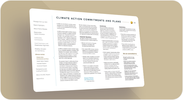 CLIMATE ACTION COMMITMENTS AND PLANS 35 Message from our CEO In 2020, we committed to maintain carbon We have adopted a Climate Action Policy, Investments Stakeholders Report Highlights neutrality at our corporate operations and, which is summarized below and formalizes We are committed to assessing the To further support the awareness of climate in 2022, we accomplished this for the third the abovementioned climate-related goals, decarbonization efforts and net-zero reduction goals, including net-zero emissions About Franco-Nevada consecutive year. targets and commitments relating to all alignment of operators and operations by 2050 or sooner, we: aspects of our business. Our Climate Action when making investment decisions. We In 2023, we set a goal to achieve net-zero Policy also establishes the measures that we are also committed to engaging with new • Ensure that our external consultants are Responsible emissions relating to our global corporate will implement to further these commitments. and existing partners on their efforts to familiar with our support for the goal of Capital Allocation operations (our “Corporate Emissions”) decarbonize and achieve net-zero emissions decarbonization and net-zero emissions by 2050, in line with global efforts to limit Corporate Operations by 2050 or sooner. To achieve this, we: by 2050 or sooner and understand Community warming to 1.5°C (“net-zero emissions by We aspire to achieve net-zero Corporate Franco-Nevada’s commitments under Contributions 2050 or sooner”). While our commitment Emissions by 2050. To reach this goal, we: • Assess the decarbonization commitments, the Climate Action Policy; and to carbon neutrality primarily involves the plans, targets and initiatives of operators, purchase of carbon offsets, our net-zero • Measure and record our Corporate including commitments to or progress • Ensure, before transacting with any Good Governance and aspiration entails a concerted effort to Emissions in accordance with towards achieving net-zero emissions significant provider of goods for our Shareholder Alignment reduce our absolute emissions. the Greenhouse Gas Protocol; by 2050 or sooner in our due diligence corporate operations, that such supplier processes when evaluating new is aligned with the goal of net-zero Diversity, Inclusion In 2024, we adopted emission reduction targets • Have adopted GHG emission reduction opportunities; emissions by 2050 or sooner. and Well-Being for our corporate operations, including a 42% targets for our Corporate Emissions in reduction of our Scope 1 and 2 emissions line with the achievement of net-zero • Monitor operators’ decarbonization efforts We are committed to: Climate Action by 2030 and a 30% reduction of our overall emissions by 2050 or sooner; and progress towards net-zero emissions Corporate Emissions (Scope 1, 2 and 3, by 2050 or sooner and endeavour to Climate Action excluding financed emissions) by 2030, • Maintain carbon neutrality on an annual include contractual provisions requiring • Our goal to achieve net-zero Commitments and Plans each from a 2023 base year. basis for our Corporate Emissions by operators to provide us with sufficient Corporate Emissions by 2050 purchasing high quality carbon offsets information in order to do so; or sooner Overall Carbon Footprint Our greatest impact in addressing climate for those Corporate Emissions that • Achieve our emission reduction Corporate Footprint change is through deploying capital to cannot be eliminated; and • Measure and record our attributable targets relating to our global responsible operators and operations emissions from our royalty and stream Corporate Emissions by 2030 Investment Footprint committed to reducing carbon footprints • Report on our progress and provide interests in accordance with the • Assess the decarbonization efforts and environmental impacts. Accordingly, climate-related disclosures aligned Greenhouse Gas Protocol and other and net-zero alignment of operators Transparency and we have also committed to assess the with the recommendations from the leading supplementary guidance; and and operations when making Guiding Principles decarbonization efforts and net-zero alignment, Task Force for Climate-related Financial investment decisions including with respect to the commitments, Disclosures (TCFD) and regulatory • Explore options on how we may assist • Engage with new and existing About this ESG Report plans, targets and initiatives, of operators and requirements applicable to our company. operators’ energy transitions, climate-related operators on their efforts to operations when making investment decisions community and other initiatives, and/or decarbonize and achieve net-zero emissions by 2050 or sooner Appendices and to engage with new and existing partners other activities aimed at decarbonization • Further awareness of and support on their efforts to decarbonize and achieve Related Policies and achieving net-zero emissions by 2050 for climate reduction goals, including net-zero emissions by 2050 or sooner. and Statements: or sooner. net-zero emissions by 2050 or sooner, • Climate Action Policy with our stakeholders