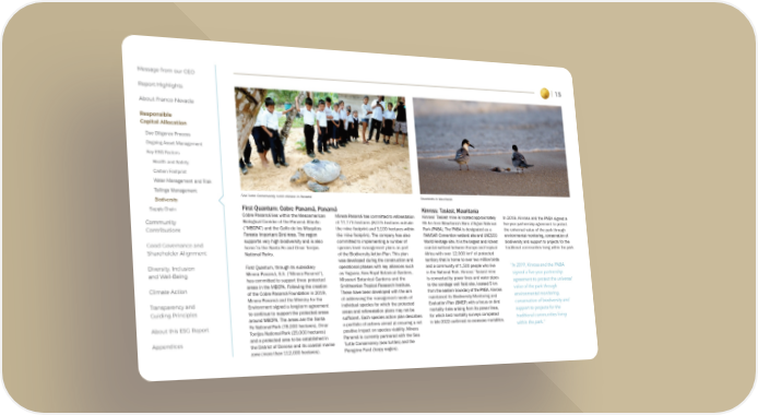 15 Message from our CEO Report Highlights About Franco-Nevada Responsible Capital Allocation Due Diligence Process Ongoing Asset Management Key ESG Factors Health and Safety Carbon Footprint Water Management and Risk Tailings Management Biodiversity Supply Chain Community Contributions Good Governance and Shareholder Alignment Diversity, Inclusion and Well-Being Climate Action Transparency and Guiding Principles About this ESG Report Appendices First Quantum: Cobre Panamá, Panamá Cobre Panamá lies within the Mesoamerican Biological Corridor of the Panamá Atlantic (“MBCPA”) and the Golfo de los Misquitos Forests Important Bird Area. The region supports very high biodiversity and is also home to the Santa Fe and Omar Torrijos National Parks. First Quantum, through its subsidiary Minera Panamá, S.A. (“Minera Panamá”), has committed to support three protected areas in the MBCPA. Following the creation of the Cobre Panamá Foundation in 2019, Minera Panamá and the Ministry for the Environment signed a long-term agreement to continue to support the protected areas around MBCPA. The areas are the Santa Fe National Park (78,000 hectares), Omar Torrijos National Park (25,000 hectares) and a protected area to be established in the District of Donoso and its coastal marine zone (more than 112,000 hectares). Minera Panamá has committed to reforestation of 11,175 hectares (8,075 hectares outside the mine footprint and 3,100 hectares within the mine footprint). The company has also committed to implementing a number of species level management plans as part of the Biodiversity Action Plan. This plan was developed during the construction and operational phases with key alliances such as Yaguara, Kew Royal Botanical Gardens, Missouri Botanical Gardens and the Smithsonian Tropical Research Institute. These have been developed with the aim of addressing the management needs of individual species for which the protected areas and reforestation plans may not be sufficient. Each species action plan describes a portfolio of actions aimed at ensuring a net positive impact on species viability. Minera Panamá is currently partnered with the Sea Turtle Conservancy (sea turtles) and the Peregrine Fund (harpy eagles). Kinross: Tasiast, Mauritania Kinross’ Tasiast mine is located approximately 65 km from Mauritania’s Banc d’Arguin National Park (PNBA). The PNBA is designated as a RAMSAR Convention wetland site and UNESCO World Heritage site. It is the largest and richest coastal wetland between Europe and tropical Africa with over 12,000 km² of protected territory that is home to over two million birds and a community of 1,500 people who live in the National Park. Kinross’ Tasiast mine is connected by power lines and water pipes to the sondage well field site, located 5 km from the eastern boundary of the PNBA. Kinross maintained its Biodiversity Monitoring and Evaluation Plan (BMEP) with a focus on bird mortality risks arising from its power lines, for which bird mortality surveys completed in late 2022 confirmed no excessive mortalities. In 2019, Kinross and the PNBA signed a five-year partnership agreement to protect the universal value of the park through environmental monitoring, conservation of biodiversity and support to projects for the traditional communities living within the park. Sea Turtle Conservancy turtle release in Panamá Shorebirds in Mauritania "In 2019, Kinross and the PNBA signed a five-year partnership agreement to protect the universal value of the park through environmental monitoring, conservation of biodiversity and support to projects for the traditional communities living within the park."