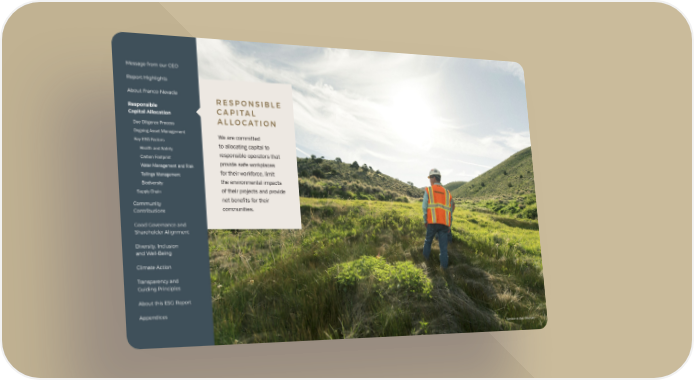 Message from our CEO Report Highlights About Franco-Nevada RESPONSIBLE Responsible CAPITAL Capital Allocation ALLOCATION Due Diligence Process Ongoing Asset Management We are committed Key ESG Factors to allocating capital to Health and Safety Carbon Footprint responsible operators that Water Management and Risk provide safe workplaces Tailings Management for their workforce, limit Biodiversity the environmental impacts Supply Chain of their projects and provide Community net benefits for their Contributions communities. Good Governance and Shareholder Alignment Diversity, Inclusion and Well-Being Climate Action Transparency and Guiding Principles About this ESG Report Appendices Operator at Bald Mountain