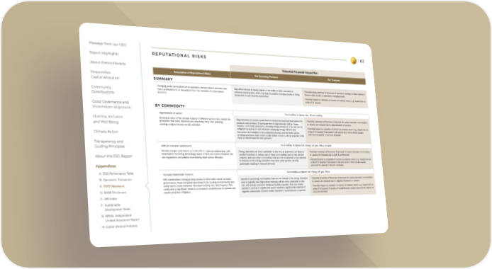 Message from our CEO 63 Report Highlights REPUTATIONAL RISKS About Franco-Nevada Potential Financial Impact for: Description of Reputational Risks Our Operating Partners Our Company Responsible SUMMARY Capital Allocation Changing public perceptions of an operator’s climate-related activities and May affect access to equity capital or the ability to raise new debt or • Potential delay (deferral) of Revenues if operator’s inability to raise capital or Community their contributions to or detractions from the transition to a low-carbon refinance existing debt, which may lead to projects changing hands or being finance debt results in operations changing hands Contributions economy. temporarily or permanently abandoned. • Potential impact to valuation of Assets on balance sheet (e.g. impairment or write-off of assets) Good Governance and BY COMMODITY Shareholder Alignment Stigmatization of sector: Commodities at highest risk: All commodities Diversity, Inclusion Growing scrutiny of the climate impacts of different sectors has created the Stigmatisation of sectors could lead to reduced demand and lower prices for • Potential reduction of Revenues if demand for carbon-intensive commodities and Well-Being perception that some industries are inherently ‘dirty’ and ‘polluting’, products and services. Of particular risk of stigmatization will be ‘heavy or assets are reduced due to stigmatization of sectors creating a stigma around certain activities. industry’ commodity producers, including energy producers. This risk can be • Potential impact to valuation of Assets on balance sheet (e.g. impairment or mitigated by operators and industries deploying energy efficient and write-off of assets) if decrease in demand and/or lower prices causes Climate Action low-carbon technologies in the production process and the lower carbon uneconomic assets to become stranded emitting producers, even within a stigmatised industry, will be rewarded while there is still demand for their products. Transparency and Guiding Principles Shifts in consumer preferences: Commodities at highest risk: Energy (oil, gas, NGLs) and gold Climate change could lead to a moral shift in customer preferences, with Energy operators are most vulnerable to this risk as customers are likely to • Potential reduction of Revenues if demand for carbon-intensive commodities About this ESG Report stakeholders becoming increasingly aware of their own carbon footprint and receive incentives to reduce use of these commodities due to their climate or assets are reduced due to shift in preferences new regulations and policies incentivising lower-carbon lifestyles. impacts. Gold and other commodities that are not considered to be essential • Potential impact to valuation of Assets on balance sheet (e.g. impairment or to industry or the energy transition may come under greater scrutiny, write-off of assets) if decrease in demand and/or lower prices causes Appendices potentially resulting in reduced demand. uneconomic assets to become stranded A: ESG Performance Table Increased stakeholder concern: Commodities at highest risk: Energy (oil, gas, NGLs) B: Operators’ Emissions With stakeholders having growing access to information about company Operators producing commodities that are not critical to the energy transition • Potential reduction of Revenues if demand for carbon-intensive commodities C: TCFD Disclosure performance, those companies perceived to be causing environmental and and/or typically have high-carbon intensity will be most vulnerable to this or assets are reduced due to negative feedback or concern social harms could encounter increased scrutiny over their impacts. This risk, with energy producers being particularly exposed. This may impact • Potential impact to valuation of Assets on balance sheet (e.g. impairment or D: SASB Disclosure could pose a significant threat to a company’s social license to operate and operator’s access to capital and asset valuations significantly impacted if write-off of assets) if erosion of social license causes uneconomic assets to require proactive mitigation. negative stakeholder concern erodes operators’ social license to operate. become stranded E: GRI Index F: Sustainable Development Goals G: KPMG: Independent Limited Assurance Report H: Carbon Neutral Initiative