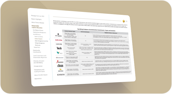 11 Message from our CEO Report Highlights About Franco-Nevada Responsible Capital Allocation Due Diligence Process Ongoing Asset Management Key ESG Factors Health and Safety Carbon Footprint Water Management and Risk Tailings Management Biodiversity Supply Chain Community Contributions Good Governance and Shareholder Alignment Diversity, Inclusion and Well-Being Climate Action Transparency and Guiding Principles About this ESG Report Appendices Mining operators, contributing to more than 90% of our 2023 mining revenues, have proactively established targets to reduce carbon emissions, including planned or actualized emission reductions derived from reliance upon renewable energy, or have made commitments to achieve net-zero emissions by 2050 or sooner. Our Top Mining Producers have adopted commitments, targets, and initiatives, as highlighted on this page. We continue to look for opportunities to deploy capital to other best-in-class operators and, as a capital provider, potentially help facilitate their low-carbon transitions. Top Mining Producers: Decarbonization Commitments, Targets and Initiatives Emission Reduction Targets Net Zero Commitments Highlighted Initiatives / Achievements Reduce Scope 1 and 2 emissions by 30% by 2025 and 50% by 2030 from 2020 baseline Reduce GHG intensity of copper mining by 50% by 2030 from 2020 baseline NA Achieved 100,000 tCO 2 e per year reduction by powering Cobre Panamá’s expansion with renewable energy. Announced goal to transition Cobre Panamá coal plant unit 1 to renewable energy by 2025 and coal plant unit 2 to renewable and natural gas mix by 2030, with a complete transition away from use of coal power by 2030. Reduce Scope 1 and 2 emissions by 35% by 2030, from 2019 baseline NA Site decarbonization roadmaps reviewed and integrated into company-wide 2030 target, with external validation planned. Power purchase agreement entered into with energy supplier at Candelaria is expected to result in increase of the use of renewables to a minimum of 80%, prioritizing wind and solar energy. Reduce Scope 1, 2 and 3 emissions by 15% by 2026 and 50% by 2035, from 2019 baseline Achieve net-zero Scope 1, 2 and 3 emissions by 2050 Renewable energy transition plans for purchased electricity with the aim of addressing Scope 2 emissions, including commercial solutions for green power purchase agreements, supported by guarantees of origin or other renewable energy generation certification. Reduce carbon intensity by 33% by 2030 Achieve net-zero Scope 2 emissions by 2025 Achieve net-zero Scope 3 emissions by 2050 Achieve net-zero emissions by 2050 Teck and other industry leaders are building the North Pacific Green Corridor (NPGC) to decarbonize the value chain of critical minerals, metals and other low-carbon products between the Canadian Pacific coast and partners in the Indo-Pacific region, with the ultimate goal for the value chain to achieve net-zero GHG emissions by 2050. Reduce Scope 1 and 2 emissions by 33% by 2030 Reduce Scope 3 net emissions by 15% by 2035 Achieve net-zero Scope 1 and 2 emissions by 2050 Portfolio of generated electricity is 98.6% renewable, primarily from hydroelectric and wind generation assets located in Brazil, Canada, and Indonesia, and Vale’s new solar project, Sol do Cerrado. These plants meet on average 61% of Vale’s global electricity consumption and 72% of consumption in Brazil, supporting Vale’s goal to use 100% renewable energy in Brazil by 2025 and globally by 2030. Reduce net emission intensity by 35% by 2024, from 2018-2019 baseline NA Conducted climate scenario analysis workshops and energy and emissions diagnostics at each site, completing an initial Scope 3 GHG emissions assessment and developed modeling and data measurement tools to enhance understanding of climate footprint and associated risks and opportunities. Reduce Scope 1 and 2 emissions by 40% by 2031 and by 63% by 2036, from 2021 baseline Achieve net-zero emissions by 2045 In May 2023, as Phase 1 of its decarbonisation plan, Harmony commissioned 30MW of solar power (resulting in a carbon reduction of 62,000t a year), contributing to Harmony’s goal to increase its renewable energy consumption to 25% by 2027. Reduce Scope 1 and 2 carbon emissions by 27.3% by 2025, from 2010 baseline Achieve carbon neutrality for Scope 1 and 2 emissions by 2040 and net-zero emissions by 2050 Five ongoing battery electric vehicle trials company-wide, covering a range of applications in utility, load and haul, and personnel carriers, supporting Sibanye-Stillwater’s goal of 20% renewable energy production by 2030. Reduce Scope 1 and 2 emissions by 30% by 2030, from 2021 baseline Achieve net-zero emissions by 2050 Implementation of technology transition initiatives, such as electrification of material handling equipment (e.g. a trolley-assist system for haul trucks at Detour Lake (expected to result in annual carbon reductions of up to 96 ktCO 2 e; nearly a third of expected direct emissions at Detour Lake)), and increased use of battery electric vehicles and secondary life applications for batteries across Agnico’s operations. Reduce Scope 1 and 2 emissions by 30% by 2030, from 2021 baseline Achieve net-zero emissions by 2050 Tasiast solar plant is expected to provide annualized fuel savings of 17 million litres of heavy oil and approximately 20% of the site’s power. A total of around 88,000 photovoltaic panels will be installed with annualized GHG emissions reductions estimated at 50 kilotonnes CO 2 e, representing approximately 2% of GHG emissions profile.