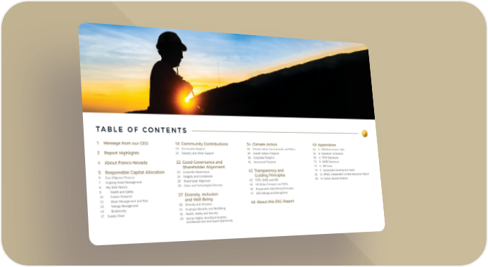 TABLE OF CONTENTS 1 Message from our CEO 18 Community Contributions 34 Climate Action 49 Appendices 19 Community Support 35 Climate Action Commitments and Plans 50 A: ESG Performance Table 2 Report Highlights 21 Industry and Other Support 36 Overall Carbon Footprint 52 B: Operators’ Emissions 38 Corporate Footprint 56 C: TCFD Disclosure 4 About Franco-Nevada 22 Good Governance and 41 Investment Footprint 72 D: SASB Disclosure Shareholder Alignment 75 E: GRI Index 5 Responsible Capital Allocation 23 Corporate Governance 42 Transparency and 79 F: Sustainable Development Goals 6 Due Diligence Process 24 Integrity and Compliance Guiding Principles 81 G: KPMG: Independent Limited Assurance Report 7 Ongoing Asset Management 25 Shareholder Alignment 43 TCFD, SASB, and GRI 82 H: Carbon Neutral Initiative 8 Key ESG Factors 26 Cyber and Technological Security 44 UN Global Compact and SDGs 9 Health and Safety 45 Responsible Gold Mining Principles 10 Carbon Footprint 27 Diversity, Inclusion 47 ESG Ratings and Recognition 12 Water Management and Risk and Well-Being 13 Tailings Management 28 Diversity and Inclusion 48 About this ESG Report 14 Biodiversity 31 Employee Benefits and Well-Being 17 Supply Chain 32 Health, Safety and Security 33 Human Rights, Non-Discrimination, Anti-Harassment and Equal Opportunity
