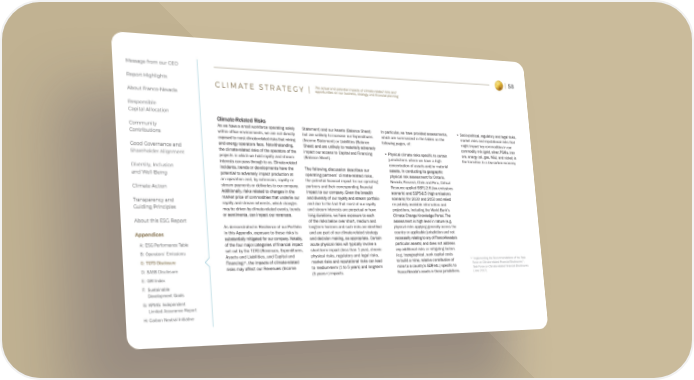 Message from our CEO 58 Report Highlights The actual and potential impacts of climate-related risks and CLIMATE STRATEGY | opportunities on our business, strategy, and financial planning About Franco-Nevada Responsible Capital Allocation Climate-Related Risks Community As we have a small workforce operating solely Statement) and our Assets (Balance Sheet) In particular, we have provided assessments, • Socio-political, regulatory and legal risks, Contributions within office environments, we are not directly but are unlikely to increase our Expenditures which are summarized in the tables on the market risks and reputational risks that exposed to most climate-related risks that mining (Income Statement) or Liabilities (Balance following pages, of: might impact key commodities in our Good Governance and and energy operators face. Notwithstanding, Sheet) and are unlikely to materially adversely commodity mix (gold, silver, PGMs, iron Shareholder Alignment the climate-related risks of the operators of the impact our access to Capital and Financing • Physical climate risks specific to certain ore, energy (oil, gas, NGL) and nickel) in projects in which we hold royalty and stream (Balance Sheet). jurisdictions where we have a high the transition to a low-carbon economy. interests can pass through to us. Climate-related concentration of assets and/or material Diversity, Inclusion incidents, trends or developments have the The following discussion describes our assets. In conducting its geographic and Well-Being potential to adversely impact production at operating partners’ climate-related risks, physical risk assessment for Ontario, an operation and, by extension, royalty or the potential financial impact for our operating Nevada, Panamá, Chile and Peru, Critical Climate Action stream payments or deliveries to our company. partners and their corresponding financial Resource applied SSP1-2.6 (low emissions Additionally, risks related to changes in the impact to our company. Given the breadth scenario) and SSP5-8.5 (high emissions Transparency and market price of commodities that underlie our and diversity of our royalty and stream portfolio scenario) for 2030 and 2050 and relied Guiding Principles royalty and stream interests, which changes and due to the fact that most of our royalty on publicly available information and may be driven by climate-related events, trends and stream interests are perpetual or have projections, including the World Bank’s or sentiments, can impact our revenues. long durations, we have exposure to each Climate Change Knowledge Portal. The About this ESG Report of the risks below over short, medium and assessment is high level in nature (e.g. As demonstrated in Resilience of our Portfolio long-term horizons and such risks are identified physical risks applying generally across the Appendices in this Appendix, exposure to these risks is and are part of our climate-related strategy country or applicable jurisdiction and not substantially mitigated for our company. Notably, and decision making, as appropriate. Certain necessarily relating to any of Franco-Nevada’s A: ESG Performance Table of the four major categories of financial impact acute physical risks will typically involve a particular assets) and does not address B: Operators’ Emissions set out by the TCFD (Revenues, Expenditures, short-term impact (less than 1 year), chronic any additional risks or mitigating factors Assets and Liabilities, and Capital and physical risks, regulatory and legal risks, (e.g. topographical, sunk capital costs C: TCFD Disclosure Financing)*, the impacts of climate-related market risks and reputational risks can lead to build a mine, relative contribution of * “Implementing the Recommendations of the Task risks may affect our Revenues (Income to medium-term (1 to 5 years) and long-term mine to a country’s GDP, etc.) specific to Force on Climate-related Financial Disclosures”, D: SASB Disclosure Task Force on Climate-related Financial Disclosures E: GRI Index (5 years+) impacts. Franco-Nevada’s assets in these jurisdictions. (June 2017). F: Sustainable Development Goals G: KPMG: Independent Limited Assurance Report H: Carbon Neutral Initiative