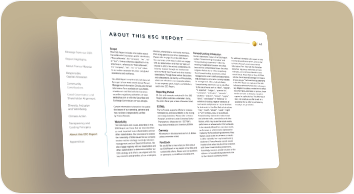 48 Message from our CEO Report Highlights About Franco-Nevada Responsible Capital Allocation Community Contributions Good Governance and Shareholder Alignment Diversity, Inclusion and Well-Being Climate Action Transparency and Guiding Principles About this ESG Report Appendices A B O U T T H I S E S G R E P O R T Scope This ESG Report includes information about Franco-Nevada Corporation and its subsidiaries (“Franco-Nevada”, the “company”, “we”, “us” or “our”). Unless otherwise specified in this ESG Report, reference to “Franco-Nevada”, the “company”, “we”, “us” or “our” refers to our entire corporate structure and global operations and workforce. This ESG Report complements but does not form part of our most recent Annual Report, Management Information Circular, and Annual Information Form available at www.franco- nevada.com and filed with the Canadian securities regulatory authorities on www. sedarplus.com or with the Securities and Exchange Commission on www.sec.gov . Certain information is based on the public disclosure of our operating partners and has not been independently verified by Franco-Nevada. Materiality The ESG topics and issues described in this ESG Report are those that we have identified as most important to our shareholders and our other stakeholders. Our processes to assess the materiality of ESG issues for our company involve routine strategy meetings between management and our Board of Directors. We also engage regularly with our shareholders and other stakeholders to determine whether our ESG strategy and efforts are aligned with the key concerns and priorities of our employees, directors, shareholders, community members, ESG rating agencies and other stakeholders. Please refer to page 25 of this ESG Report for a summary of the ways in which we engage with our stakeholders and their key topics of interest in 2023. We actively collaborate with industry leaders through our involvement with the World Gold Council and other industry associations. Through these various discussions and collaborations, we identify our ESG priorities, which are reflected in our corporate policies, in our corporate goals, targets and initiatives, and in this ESG Report. Reporting Period All data and examples contained in this ESG Report reflect activities undertaken during the 2023 fiscal year, unless otherwise noted. ESTMA Franco-Nevada supports efforts to increase transparency and accountability in the mining and energy industries. Please refer to Franco- Nevada’s enrollment under Extractive Sector Transparency Measures Act (“ESTMA”): www.franco-nevada.com/investors/ESTMA Currency All amounts in this document are in U.S. dollars unless otherwise noted. Feedback We would like to hear what you think about our ESG Report or any aspect of our ESG and sustainability efforts. Please send any questions or comments to [email protected]. Forward-Looking Information Certain statements made in this ESG Report contain “forward-looking information” and “forward-looking statements” within the meaning of applicable Canadian securities laws and the United States Private Securities Litigation Reform Act of 1995 , respectively. Such forward-looking statements reflect management’s current beliefs and assumptions and are based on information currently available to management. Often, but not always, forward-looking statements can be identified by the use of words such as “plans”, “expects”, “is expected”, “budgets”, “potential for”, “scheduled”, “estimates”, “forecasts”, “predicts”, “projects”, “intends”, “targets”, “aims”, “anticipates” or “believes” or variations (including negative variations) of such words and phrases or may be identified by statements to the effect that certain actions “may”, “could”, “should”, “would”, “might” or “will” be taken, occur or be achieved. Forward-looking statements involve known and unknown risks, uncertainties and other factors, which may cause the actual results, performance or achievements of Franco-Nevada to be materially different from any future results, performance or achievements expressed or implied by the forward-looking statements. Many factors could cause actual events or results to differ materially from any forward-looking statement. Franco-Nevada cannot assure investors that actual results will be consistent with these forward-looking statements. Accordingly, investors should not place undue reliance on forward-looking statements due to the inherent uncertainty therein. For additional information with respect to risks, uncertainties and assumptions, please refer to Franco-Nevada’s most recent Annual Information Form filed with the Canadian securities regulatory authorities on www. sedarplus.com and Franco-Nevada’s most recent Annual Report filed on Form 40-F filed with the Securities and Exchange Commission on www.sec.gov . The forward-looking statements in this ESG Report are made as of the date indicated and Franco-Nevada does not assume any obligation to update or revise them to reflect new information, estimates or opinions, future events or results or otherwise, except as required by applicable law. This ESG Report does not constitute an offer to sell or a solicitation for an offer to purchase any security in any jurisdiction.