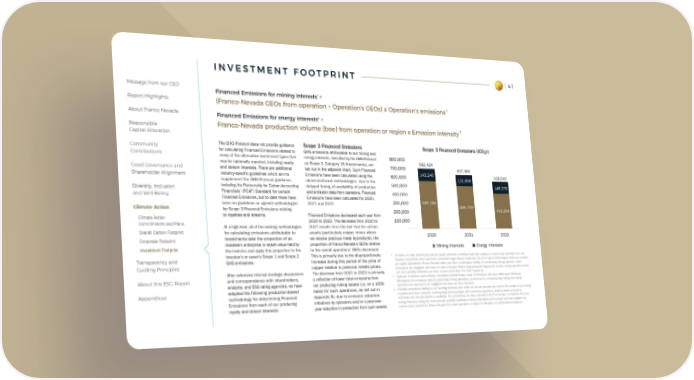 41 Message from our CEO Report Highlights About Franco-Nevada Responsible Capital Allocation Community Contributions Good Governance and Shareholder Alignment Diversity, Inclusion and Well-Being Climate Action Climate Action Commitments and Plans Overall Carbon Footprint Corporate Footprint Investment Footprint Transparency and Guiding Principles About this ESG Report Appendices - 100,000 200,000 300,000 400,000 500,000 600,000 700,000 800,000 2022 2021 2020 692,424 143,240 549,184 627,365 131,656 495,709 558,640 146,376 412,264 Mining Interests Energy Interests I N V E S T M E N T F O O T P R I N T The GHG Protocol does not provide guidance for calculating Financed Emissions related to many of the alternative investment types that may be optionally reported, including royalty and stream interests. There are additional industry-specific guidelines which aim to supplement the GHG Protocol guidance, including the Partnership for Carbon Accounting Financials’ (PCAF) Standard for certain Financed Emissions, but to date there have been no guidelines or agreed methodologies for Scope 3 Financed Emissions relating to royalties and streams. At a high level, all of the existing methodologies for calculating emissions attributable to investments take the proportion of an investee’s enterprise or asset value held by the investor, and apply this proportion to the investee’s or asset’s Scope 1 and Scope 2 GHG emissions. After extensive internal strategic discussions and correspondence with shareholders, analysts, and ESG rating agencies, we have adopted the following production-based methodology for determining Financed Emissions from each of our producing royalty and stream interests: Scope 3 Financed Emissions GHG emissions attributable to our mining and energy interests, classified by the GHG Protocol as Scope 3, Category 15 (Investments), are set out in the adjacent chart. Such Financed Emissions have been calculated using the abovementioned methodologies. Due to the delayed timing of availability of production and emission data from operators, Financed Emissions have been calculated for 2020, 2021 and 2022. Financed Emissions decreased each year from 2020 to 2022. The decrease from 2020 to 2021 results from the fact that for certain assets (particularly copper mines where we receive precious metal by-products), the proportion of Franco-Nevada’s GEOs relative to the overall operations’ GEOs decreased. This is primarily due to the disproportionate increase during this period of the price of copper relative to precious metals prices. The decrease from 2021 to 2022 is primarily a reflection of lower total emissions from our producing mining assets (i.e. on a 100% basis for such operations, as set out in Appendix B ), due to emission reduction initiatives by operators and/or a year-over- year reduction in production from such assets. Financed Emissions for mining interests * = (Franco-Nevada GEOs from operation ÷ Operation’s GEOs) x Operation’s emissions † Financed Emissions for energy interests ◊ = Franco-Nevada production volume (boe) from operation or region x Emission intensity † * Includes our Vale debentures and our equity interests in entities that hold royalties on Carol Lake (Labrador Iron Ore Royalty Corporation) and Caserones (Socieded Legal Minera California Una de la Sierra Peña Negra), which we consider as royalty equivalents. Franco-Nevada holds one other small equity holding of a producing mining operator, which emissions are negligible and have not been included. Where total production figures for certain mining operations have not been publicly disclosed, we have sourced such data from S&P Capital IQ. † Operator emissions and emission intensities include Scope 1 and 2 emissions. We have relied upon McKinsey MineSpans for emissions data for producing mining operations. Emissions for non-producing mining and energy operators are deemed to be negligible and have not been included. ◊ Includes emissions relating to our working interests over which we do not exercise any control. For certain of our energy royalties and other interests covering large land packages with numerous operators, asset-by-asset emissions estimates are not practicable or available. For consistency, we have calculated all of our Scope 3 emissions from our energy interests using the most accurate publicly available emission intensities (tCO 2 e/boe) and have applied the volume (boe) received by Franco-Nevada from each operation or region to calculate our attributable emissions. Scope 3 Financed Emissions (tCO 2 e)