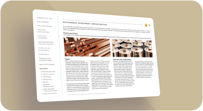 Message from our CEO 65 Report Highlights SUSTAINABLE INVESTMENT OPPORTUNITIES About Franco-Nevada As a company with a diversified royalty and streaming portfolio, we are well positioned to participate in sustainable investment opportunities arising in connection with the transition to a low-carbon economy. The following describes sustainable investment opportunities that we have already embraced in our portfolio and that we expect will continue to be available to our company in the short, Responsible medium and long-term. Capital Allocation Products and Services Our investments in commodities used for low emission products and services may increase revenues and bring competitive advantage due to the increased demand from shifting consumer preferences. Community Contributions Good Governance and Shareholder Alignment Diversity, Inclusion and Well-Being Climate Action Transparency and Copper: Nickel and Clean Energy Metals: Guiding Principles With its superior electrical and thermal copper concentrates. In 2021, we acquired While most of the global demand for nickel Technologies involved in the clean energy conductivity, copper will play a significant role another precious metal stream from the is for the production of stainless steel, nickel transition are emerging and advancing rapidly About this ESG Report in enhancing energy efficiency and decarbonizing Condestable copper mine in Peru and, sulphate, a highly purified nickel compound through innovation and increased deployment. the planet. A 2017 World Bank report* counted in 2022 and 2023, acquired, in several that helps achieve higher energy density in Over the past several years, our company Appendices dozens of metals that could see a growing market acquisitions, an effective royalty on the lithium-ion batteries, extending the driving has evaluated cobalt, lithium, rare earth, with the increasing reliance on renewable and Caserones copper-molybdenum mine in range of electric vehicles, is expected to uranium and other battery metal and clean A: ESG Performance Table sustainable energy sources. Copper ranked first Chile. Strong demand for copper increases become the second largest application for energy opportunities. In particular, we are B: Operators’ Emissions (tied with aluminum and nickel) among all metals the prospects of greater production from nickel by 2030. Our company has royalties building capabilities to evaluate lithium for its prevalence in low-carbon technologies, these operations. We also have royalties on on nickel projects, including the Mt. Keith opportunities, which are in many ways C: TCFD Disclosure including in wind, solar photovoltaic, carbon a number of prospective copper development nickel mine in Australia, Eagle’s Nest deposit geologically and technically dissimilar to D: SASB Disclosure capture and storage, nuclear power, light emitting projects, including Copper World (Hudbay), in the Ring of Fire in Ontario, Canada and precious and base metals projects. E: GRI Index diodes, electric vehicles and electric motors. Alpala (SolGold), Taca Taca (First Quantum) the Crawford nickel-cobalt project in Ontario, and NuevaUnión (Teck and Newmont). We Canada. These projects are poised to benefit F: Sustainable Franco-Nevada’s top revenue generating stream expect that in the future there will be further from the increasing demand for nickel and Development Goals interests are from copper mines, including opportunities for our company to fund copper we expect to see more opportunities to fund G: KPMG: Independent certain of our Top Mining Assets (Cobre Panamá, operations, to receive interests in copper nickel and other battery metal projects. Limited Assurance Report Antapaccay, Antamina and Candelaria) where and/or precious metal by-products. we receive precious metal by-products from H: Carbon Neutral Initiative * “The Growing Role of Minerals and Metals for a Low-carbon Future”, World Bank Group, June 2017.