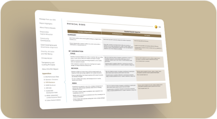 Message from our CEO Report Highlights About Franco-Nevada Responsible Capital Allocation Community Contributions Good Governance and Shareholder Alignment Diversity, Inclusion and Well-Being Climate Action Transparency and Guiding Principles About this ESG Report Appendices A: ESG Performance Table B: Operators’ Emissions C: TCFD Disclosure D: SASB Disclosure E: GRI Index F: Sustainable Development Goals G: KPMG: Independent Limited Assurance Report H: Carbon Neutral Initiative 59 Potential Financial Impact for: Description of Physical Risks Our Operating Partners Our Company SUMMARY Acute: Extreme weather events caused by global warming (e.g. droughts, floods, hurricanes, etc.) These events may lead to production delays and cessation of operations • Short-term delay (deferral) of Revenues Chronic: Gradual shifts in weather conditions (e.g. water scarcity, shifts in rainfall patterns, rising sea levels, etc.) These shifts may lead to recurring production delays and cessations of operations and increased operating costs to adapt to climate changes, which may lead to projects being abandoned or placed on care and maintenance if adaptation costs erode anticipated profitability • Longer-term and potentially recurring delays (deferrals) of Revenues • Potential impact to valuation of Assets on balance sheet (e.g. impairment or write-off of assets) BY JURISDICTION CHILE • Reduction in annual precipitation rates is likely to exacerbate Chile’s pre-existing issues of water stress as well as the frequency and length of droughts • Despite an overall trend towards decreasing precipitation, extreme rainfall events are expected to intensify • Chile is projected to experience lower rates of warming than the global average, yet rising temperatures still pose risks Main risks: Health and safety of employees; social license to operate as increasing temperatures and decreasing rainfalls leads to loss of biodiversity; inability to permit new mines or mine life extensions using ground water Financial impacts to operations: Reduction in revenue due to production delays; increased operational costs (i.e. repairs to operations, energy costs) Revenue could be impacted in the short, medium or long-term due to interruptions to production caused by physical climate hazards Risk of stranded Assets: Low-medium NEVADA • Nevada is at high risk of extreme heat, with the increased severity and frequency of heat waves posing a significant risk to people and projects • There is a high likelihood that rising temperatures will increase the severity and intensity of droughts • The risk of wildfires will increase, while flooding and storms may also become more common Main risks: Health and safety of employees; social license to operate given water scarcity issues caused by extreme heat in some areas Financial impacts to operations: Reduction in revenue due to production delays; increased operational costs (i.e. repairs to operations, energy costs) Revenue could be impacted in the short, medium or long-term due to interruptions to production caused by physical climate hazards Risk of stranded Assets: Low PERU • Temperatures are projected to rise in Peru, creating an increased risk of extreme heat, while increased rainfall also raises the risk of flooding, landslides and storms • The impact of climate change on precipitation rates is expected to vary considerably across Peru • Glacial retreat is occurring at an accelerated rate in Peru, increasing the risk of floods and landslides • Climate change could exacerbate existing water stress, creating challenges for mining operations Main risks: Health and safety of employees; social license to operate given water scarcity issues caused by extreme heat and droughts Financial impacts to operations: Reduction in revenue due to production delays; increased operational costs (i.e. repairs to operations, energy costs) Revenue could be impacted in the short, medium or long-term due to interruptions to production caused by physical climate hazards Risk of stranded Assets: Low P H Y S I C A L R I S K S