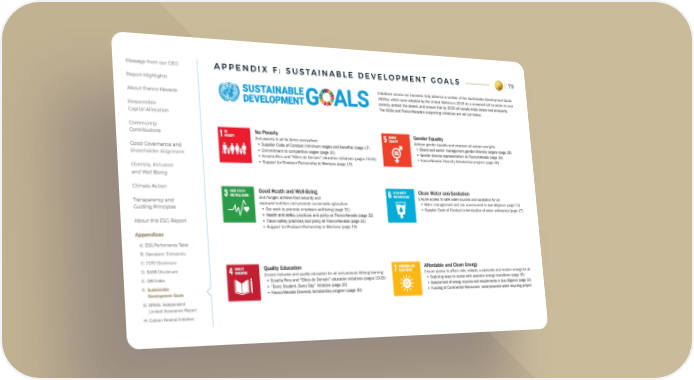 Message from our CEO APPENDIX F: SUSTAINABLE DEVELOPMENT GOALS 79 Report Highlights Initiatives across our business help advance a number of the Sustainable Development Goals About Franco-Nevada (SDGs), which were adopted by the United Nations in 2015 as a universal call to action to end poverty, protect the planet, and ensure that by 2030 all people enjoy peace and prosperity. Responsible The SDGs and Franco-Nevada’s supporting initiatives are set out below. Capital Allocation Community Contributions No Poverty Gender Equality End poverty in all its forms everywhere Achieve gender equality and empower all women and girls Good Governance and • Supplier Code of Conduct (minimum wages and benefits) (page 17) • Board and senior management gender diversity targets (page 28) Shareholder Alignment • Commitment to competitive wages (page 31) • Gender diverse representation at Franco-Nevada (page 28) • Enseña Peru and "Elites de Demain" education initiatives (pages 19-20) • Franco-Nevada Diversity Scholarship program (page 30) • Support for Producer Partnership in Montana (page 19) Diversity, Inclusion and Well-Being Climate Action Good Heath and Well-Being Clean Water and Sanitation Transparency and End hunger, achieve food security and Ensure access to safe water sources and sanitation for all Guiding Principles improved nutrition and promote sustainable agriculture • Water management and risk assessment in due diligence (page 12) • Our work to promote employee well-being (page 31) • Supplier Code of Conduct (minimization of water pollutants) (page 17) • Health and safety practices and policy at Franco-Nevada (page 32) About this ESG Report • Travel safety practices and policy at Franco-Nevada (page 32) • Support for Producer Partnership in Montana (page 19) Appendices A: ESG Performance Table B: Operators’ Emissions C: TCFD Disclosure D: SASB Disclosure Quality Education Affordable and Clean Energy E: GRI Index Ensure inclusive and quality education for all and promote lifelong learning Ensure access to afford- able, reliable, sustainable and modern energy for all • Enseña Peru and "Elites de Demain" education initiatives (pages 19-20) • Exploring ways to assist with operator energy transitions (page 35) F: Sustainable • “Every Student, Every Day” initiative (page 20) • Assessment of energy sources and requirements in due diligence (page 10) Development Goals • Franco-Nevada Diversity Scholarship program (page 30) • Funding of Continental Resources’ solar-powered water recycling project G: KPMG: Independent Limited Assurance Report H: Carbon Neutral Initiative
