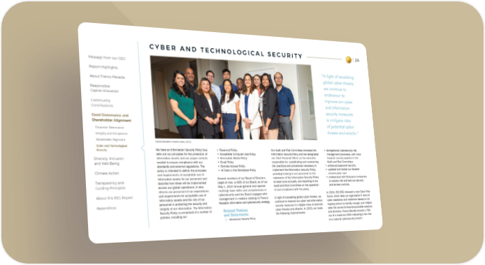 26 Message from our CEO Report Highlights About Franco-Nevada Responsible Capital Allocation Community Contributions Good Governance and Shareholder Alignment Corporate Governance Integrity and Compliance Shareholder Alignment Cyber and Technological Security Diversity, Inclusion and Well-Being Climate Action Transparency and Guiding Principles About this ESG Report Appendices C Y B E R A N D T E C H N O L O G I C A L S E C U R I T Y We have an Information Security Policy that sets out our principles for the protection of information assets and our proper controls needed to ensure compliance with our standards and external regulations. The policy is intended to define the principles and requirements of acceptable use of information assets for our personnel and describe how these will be implemented across our global operations. It also informs our personnel of our expectations and requirements for acceptable use of information assets and the role of our personnel in protecting the security and integrity of our information. The Information Security Policy is comprised of a number of policies, including our: • Password Policy • Acceptable Computer Use Policy • Removable Media Policy • Email Policy • Remote Access Policy • AI Tools in the Workplace Policy Several members of our Board of Directors (eight of nine, or 89% of our Board, as of our May 1, 2024 annual general and special meeting) have skills and competencies in cybersecurity and the Board engages with management in matters relating to Franco- Nevada’s information and cybersecurity strategy. Our Audit and Risk Committee oversees the Information Security Policy and has designated our Chief Financial Officer as the executive responsible for: establishing and maintaining the practices and procedures necessary to implement the Information Security Policy, providing training to our personnel on the substance of the Information Security Policy at least once annually, and reporting to the Audit and Risk Committee on the operation of and compliance with the policy. In light of escalating global cyber threats, we continue to improve our cyber and information security measures to mitigate risks of potential cyber threats and attacks. In 2023, we made the following improvements: Related Policies and Statements: • Information Security Policy Franco-Nevada's Finance team (2023) “In light of escalating global cyber threats, we continue to endeavour to improve our cyber and information security measures to mitigate risks of potential cyber threats and attacks.” • strengthened cybersecurity risk management processes, with more frequent security updates to the Audit and Risk Committee; • enhanced password security; • updated and tested our disaster recovery plan; and • collaborated with third-party companies to assess risk and test our security and access controls. In 2024, ISS ESG released a new Cyber Risk Score, which rates an organization's level of cyber readiness and resilience based on its ongoing actions to identify, manage, and mitigate cyber risk across its Internet-accessible networks and domains. Franco-Nevada scored a 789 out of a maximum 829, indicating a low risk of a material cybersecurity breach.