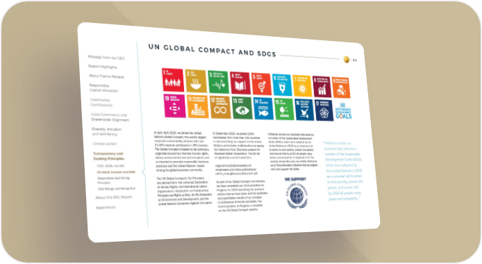44 Message from our CEO Report Highlights About Franco-Nevada Responsible Capital Allocation Community Contributions Good Governance and Shareholder Alignment Diversity, Inclusion and Well-Being Climate Action Transparency and Guiding Principles TCFD, SASB, and GRI UN Global Compact and SDGs Responsible Gold Mining Principles ESG Ratings and Recognition About this ESG Report Appendices U N G L O B A L C O M P A C T A N D S D G S In early April 2020, we joined the United Nations Global Compact, the world’s largest corporate sustainability initiative with over 21,000 corporate participants in 162 countries. The Global Compact is based on ten principles organized around four themes (human rights, labour, environmental and anti-corruption) and is intended to promote responsible business practices and the United Nations’ values among the global business community. The UN Global Compact’s Ten Principles are derived from: the Universal Declaration of Human Rights, the International Labour Organization’s Declaration on Fundamental Principles and Rights at Work, the Rio Declaration on Environment and Development, and the United Nations Convention Against Corruption. In September 2020, we joined 1000+ businesses from more than 100 countries in demonstrating our support for the United Nations and inclusive multilateralism by signing the Statement from Business Leaders for Renewed Global Cooperation. The full list of signatories can be found here: ungc-communications-assets.s3. amazonaws.com/docs/publications/ UN75_UnitingBusinessStatement.pdf As part of our Global Compact commitment, we have completed our Communication on Progress for 2023 describing the practical actions that we have taken and the qualitative and quantitative results of our company in furtherance of the ten principles. Our Communication on Progress is available on the UN Global Compact website. Initiatives across our business help advance a number of the Sustainable Development Goals (SDGs), which were adopted by the United Nations in 2015 as a universal call to action to end poverty, protect the planet, and ensure that by 2030 all people enjoy peace and prosperity. In Appendix F , for the second consecutive year, we provide disclosure as to Franco-Nevada’s initiatives that are aligned with and support the SDGs. “Initiatives across our business help advance a number of the Sustainable Development Goals (SDGs), which were adopted by the United Nations in 2015 as a universal call to action to end poverty, protect the planet, and ensure that by 2030 all people enjoy peace and prosperity. “