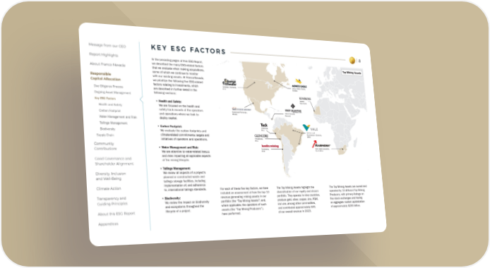 Message from our CEO KEY ESG FACTORS 8 Report Highlights In the preceding pages of this ESG Report, we described the many ESG-related factors Top Mining Assets About Franco-Nevada that we evaluate when making acquisitions, some of which we continue to monitor Responsible with our existing assets. At Franco-Nevada, Capital Allocation we prioritize the following five ESG-related factors relating to investments, which Stillwater, Montana, Detour Gold, Ontario, U.S. Canada Due Diligence Process are described in further detail in the Ongoing Asset Management following sections: Tasiast, Key ESG Factors Mauritania • Health and Safety: Health and Safety We are focused on the health and safety track records of the operators Guadalupe-Palmarejo, Cobre Panamá, Carbon Footprint and operations where we look to Mexico Panamá Water Management and Risk deploy capital. Tailings Management • Carbon Footprint: Antamina, Biodiversity Peru We evaluate the carbon footprints and Northern and climate-related commitments, targets and Southeastern Systems, Supply Chain Brazil initiatives of operators and operations. Antapaccay, Peru Community Contributions • Water Management and Risk: Candelaria, Mine Waste Solutions, We are attentive to water-related issues Chile South Africa Good Governance and and risks impacting all applicable aspects Shareholder Alignment of the mining lifecycle. • Tailings Management: Diversity, Inclusion We review all aspects of a project’s and Well-Being planned or constructed waste and tailings storage facilities, including Climate Action implementation of, and adherence to, international tailings standards. For each of these five key factors, we have The Top Mining Assets highlight the The Top Mining Assets are owned and Transparency and included an assessment of how the top 10 diversification of our royalty and stream operated by 10 different Top Mining • Biodiversity: revenue generating mining assets in our portfolio. They operate in nine countries, Producers, with primary listings on Guiding Principles We review the impact on biodiversity portfolio (the “Top Mining Assets”) and, produce gold, silver, copper, zinc, PGM, five stock exchanges and having and ecosystems throughout the where applicable, the operators of such iron ore, among other commodities, an aggregate market capitalization About this ESG Report lifecycle of a project. assets (the “Top Mining Producers”), and contributed approximately 64% of approximately $200 billion. have performed. of our overall revenue in 2023. Appendices