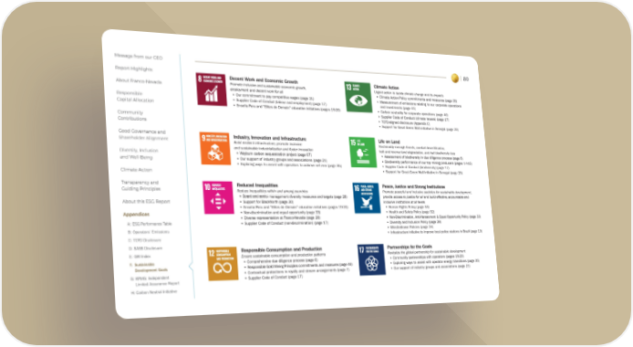 Message from our CEO Report Highlights About Franco-Nevada Responsible Capital Allocation Community Contributions Good Governance and Shareholder Alignment Diversity, Inclusion and Well-Being Climate Action Transparency and Guiding Principles About this ESG Report Appendices A: ESG Performance Table B: Operators’ Emissions C: TCFD Disclosure D: SASB Disclosure E: GRI Index F: Sustainable Development Goals G: KPMG: Independent Limited Assurance Report H: Carbon Neutral Initiative 80 Decent Work and Economic Growth Promote inclusive and sustainable economic growth, employment and decent work for all • Our commitment to pay competitive wages (page 31) • Supplier Code of Conduct (labour and employment) (page 17) • Enseña Peru and "Elites de Demain" education initiatives (pages 19-20) Climate Action Urgent action to tackle climate change and its impacts • Climate Action Policy commitments and measures (page 35) • Measurement of emissions relating to our corporate operations and investments (page 41) • Carbon neutrality for corporate operations (page 40) • Supplier Code of Conduct (climate issues) (page 17) • TCFD-aligned disclosure (Appendix C) • Support for Great Green Wall initiative in Senegal (page 20) Industry, Innovation and Infrastructure Build resilient infrastructure, promote inclusive and sustainable industrialization and foster innovation • Weyburn carbon sequestration project (page 67) • Our support of industry groups and associations (page 21) • Exploring ways to assist with operators to achieve net-zero (page 35) Life on Land Sustainably manage forests, combat desertification, halt and reverse land degradation, and halt biodiversity loss • Assessment of biodiversity in due diligence process (page 6) • Biodiversity performance of our top mining producers (pages 14-16) • Supplier Code of Conduct (biodiversity) (page 17) • Support for Great Green Wall initiative in Senegal (page 20) Reduced Inequalities Reduce inequalities within and among countries • Board and senior management diversity measures and targets (page 28) • Support for BlackNorth (page 30) • Enseña Peru and "Elites de Demain" education initiatives (pages 19-20) • Non-discrimination and equal opportunity (page 33) • Diverse representation at Franco-Nevada (page 28) • Supplier Code of Conduct (non-discrimination) (page 17) Responsible Consumption and Production Ensure sustainable consumption and production patterns • Comprehensive due diligence process (page 6) • Responsible Gold Mining Principles commitments and measures (page 46) • Contractual protections in royalty and stream arrangements (page 7) • Supplier Code of Conduct (page 17) Peace, Justice and Strong Institutions Promote peaceful and inclusive societies for sustainable development, provide access to justice for all and build effective, accountable and inclusive institutions at all levels • Human Rights Policy (page 33) • Health and Safety Policy (page 32) • Non-Discrimination, Anti-Harassment & Equal Opportunity Policy (page 33) • Diversity and Inclusion Policy (page 28) • Whistleblower Policies (page 24) • Infrastructure initiative to improve local police stations in Brazil (page 19) Partnerships for the Goals Revitalize the global partnership for sustainable development • Community partnerships with operators (pages 19-20) • Exploring ways to assist with operator energy transitions (page 35) • Our support of industry groups and associations (page 21)