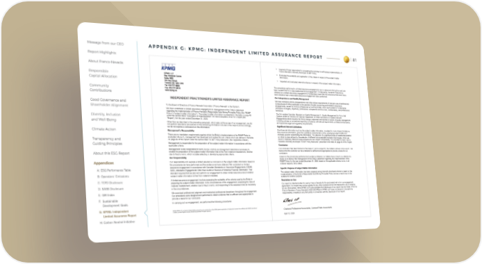81 Message from our CEO Report Highlights About Franco-Nevada Responsible Capital Allocation Community Contributions Good Governance and Shareholder Alignment Diversity, Inclusion and Well-Being Climate Action Transparency and Guiding Principles About this ESG Report Appendices A: ESG Performance Table B: Operators’ Emissions C: TCFD Disclosure D: SASB Disclosure E: GRI Index F: Sustainable Development Goals G: KPMG: Independent Limited Assurance Report H: Carbon Neutral Initiative INDEPENDENT PRACTITIONER’S LIMITED ASSURANCE REPORT To the Board of Directors of Franco-Nevada Corporation (“Franco-Nevada” or the “Entity”): We have undertaken a limited assurance engagement on management of the Entity’s statement regarding the implementation of Franco-Nevada’s Responsible Gold Mining Principles Policy (the “RGMP Policy”) (“subject matter information”). The subject matter information is presented in the table on page 46 under the section titled “Description of Implementation” of Franco-Nevada’s 2024 ESG Report (the “Report”), for the year ended December 31, 2023. Other than as described in the preceding paragraph, which sets out the scope of our engagement, we did not perform assurance procedures on the remaining information included in the Report, and accordingly, we do not express a conclusion on this information. Management’s Responsibility There are no mandatory requirements against which the Entity’s implementation of its RGMP Policy is evaluated. As such, management has developed and applied its own criteria which are defined in the table on page 46 of the Report under the section titled “RGMP Policy Measures” (the “applicable criteria”). Management is responsible for the preparation of the subject matter information in accordance with the applicable criteria. Management is also responsible for such internal controls as management determines necessary to enable the preparation of the subject matter information that is free from material misstatement, whether due to fraud or error, which includes selecting or developing appropriate criteria. Our Responsibility Our responsibility is to express a limited assurance conclusion on the subject matter information based on the procedures we have performed and the evidence we have obtained. We conducted our limited assurance engagement in accordance with Canadian Standards on Assurance Engagements (CSAE) 3000, Attestation Engagements Other than Audits or Reviews of Historical Financial Information. That standard requires that we plan and perform our engagement to obtain limited assurance about whether subject matter information is free from material misstated. A limited assurance engagement involves assessing the suitability of the criteria used by the Entity in preparing the subject matter information in the circumstances of the engagement, assessing the risks of material misstatement, whether due to fraud or error, and responding to the assessed risks as necessary in the circumstances. We exercised professional judgment and maintained professional skepticism throughout the engagement. Our procedures were designed and performed to obtain evidence that is sufficient and appropriate to provide a basis for our conclusion. In carrying out our engagement, we performed the following procedures: • Inquired of those responsible for completing the activities to self-assess implementation of Franco-Nevada’s internally developed RGMP Policy; • Evaluated the suitability and application of the criteria in respect of the subject matter information; • Inspected and evaluated relevant evidence in respect of the subject matter information. The procedures performed in a limited assurance engagement vary in nature and timing from and are less in extent than for a reasonable assurance engagement. Consequently, the level of assurance obtained in a limited assurance engagement is substantially lower than the assurance that would have been obtained had a reasonable assurance engagement been performed. Our Independence and Quality Management We have complied with the independence and other ethical requirements of relevant rules of professional conduct/code of ethics applicable to the practice of public accounting and related to assurance engagements, issued by various professional accounting bodies, which are founded on fundamental principles of integrity, objectivity, professional competence and due care, confidentiality, and professional behaviour. The firm applies Canadian Standard on Quality Management 1 , Quality Management for Firms that Perform Audits or Reviews of Financial Statements, or Other Assurance or Related Services Engagements which requires the firm to design, implement and operate a system of quality management, including policies or procedures regarding compliance with ethical requirements, professional standards, and applicable legal and regulatory requirements. Significant Inherent Limitations Non-financial information such as the subject matter information, is subject to more inherent limitations than financial information, given the qualitative characteristics of the underlying subject matter and methods used for determining this information. The absence of a significant body of established practice on which to draw allows for the selection of different but acceptable evaluation techniques, which can result in materially different measurements and can impact comparability. It is important to read Franco- Nevada’s internally developed “RGMP Policy Measures” presented in the table on page 46 of the Report. Conclusion Our conclusion has been formed on the basis of, and is subject to, the matters outlined in this report. We believe that the evidence we have obtained is sufficient and appropriate to provide a basis for our conclusion. Based on the procedures performed and evidence obtained, no matters have come to our attention to cause us to believe that management of the Entity’s stateme