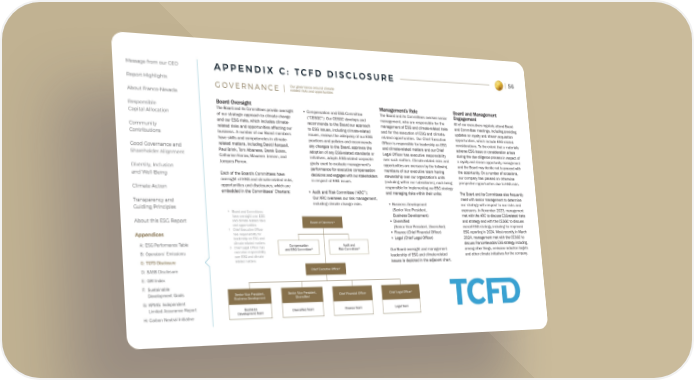 Message from our CEO APPENDIX C: TCFD DISCLOSURE 56 Report Highlights Our governance around climate- GOVERNANCE | related risks and opportunities About Franco-Nevada Responsible Board Oversight Management’s Role Board and Management Capital Allocation The Board and its Committees provide oversight • Compensation and ESG Committee The Board and its Committees oversee senior Engagement of our strategic approach to climate change (“CESGC”): Our CESGC develops and management, who are responsible for the All of our executives regularly attend Board and our ESG risks, which includes climate- recommends to the Board our approach management of ESG and climate-related risks and Committee meetings, including providing Community related risks and opportunities affecting our to ESG issues, including climate-related and for the execution of ESG and climate- updates on royalty and stream acquisition Contributions business. A number of our Board members issues, reviews the adequacy of our ESG related opportunities. Our Chief Executive opportunities, which include ESG-related have skills and competencies in climate- practices and policies and recommends Officer is responsible for leadership on ESG considerations. To the extent that a materially Good Governance and related matters, including David Harquail, any changes to the Board, approves the and climate-related matters and our Chief adverse ESG issue or consideration arises Shareholder Alignment Paul Brink, Tom Albanese, Derek Evans, adoption of any ESG-related standards or Legal Officer has executive responsibility during the due diligence process in respect of Catharine Farrow, Maureen Jensen, and initiatives, adopts ESG-related corporate over such matters. Climate-related risks and a royalty and stream opportunity, management Jacques Perron. goals used to evaluate management’s opportunities are overseen by the following and the Board may decide not to proceed with Diversity, Inclusion performance for executive compensation members of our executive team having the opportunity. On a number of occasions, and Well-Being Each of the Board’s Committees have decisions and engages with our stakeholders stewardship over our organization’s units our company has passed on otherwise oversight of ESG and climate-related risks, in respect of ESG issues. (including within our subsidiaries), each being prospective opportunities due to ESG risks. Climate Action opportunities and disclosures, which are responsible for implementing our ESG strategy embedded in the Committees’ Charters: • Audit and Risk Committee (“ARC”): and managing risks within their units: The Board and its Committees also frequently Transparency and Our ARC oversees our risk management, meet with senior management to determine Guiding Principles including climate change risks. • Business Development our strategy with respect to our risks and * Board and Committees (Senior Vice President, exposures. In November 2023, management have oversight over ESG Business Development) met with the ARC to discuss ESG-related risks About this ESG Report and climate-related risks Board of Directors* • Diversified and strategy and with the CESGC to discuss and opportunities (Senior Vice President, Diversified) overall ESG strategy, including for improved † Chief Executive Officer • Finance (Chief Financial Officer) ESG reporting in 2024. Most recently, in March Appendices has responsibility for leadership on ESG and • Legal (Chief Legal Officer) 2024, management met with the CESGC to A: ESG Performance Table climate-related matters Compensation Audit and discuss Franco-Nevada’s ESG strategy, including, ◊ Chief Legal Officer has and ESG Committee* Risk Committee* Our Board oversight and management among other things, emission reduction targets B: Operators’ Emissions executive responsibility over ESG and climate- leadership of ESG and climate-related and other climate initiatives for the company. C: TCFD Disclosure related matters issues is depicted in the adjacent chart. D: SASB Disclosure † Chief Executive Officer E: GRI Index F: Sustainable Development Goals Senior Vice President, Senior Vice President, Chief Financial Officer Chief Legal Officer◊ G: KPMG: Independent Business Development Diversified Limited Assurance Report Business Development Team Diversified Team Finance Team Legal Team H: Carbon Neutral Initiative