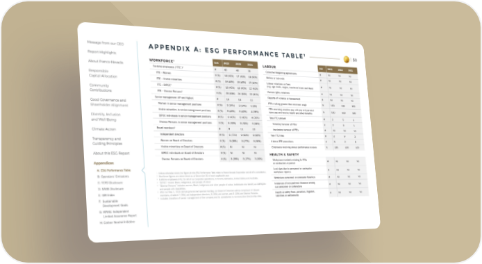 Message from our CEO Report Highlights About Franco-Nevada Responsible Capital Allocation Community Contributions Good Governance and Shareholder Alignment Diversity, Inclusion and Well-Being Climate Action Transparency and Guiding Principles About this ESG Report Appendices A: ESG Performance Table B: Operators’ Emissions C: TCFD Disclosure D: SASB Disclosure E: GRI Index F: Sustainable Development Goals G: KPMG: Independent Limited Assurance Report H: Carbon Neutral Initiative 50 A P P E N D I X A : E S G P E R F O R M A N C E T A B L E 1 1 Unless otherwise noted, the figures in this ESG Performance Table relate to Franco-Nevada Corporation and all of its subsidiaries. 2 Workforce figures are determined as at December 31 of each applicable year. 3 Full-time employees (FTE) for all of our corporate operations, in Toronto, Barbados, United States and Australia. 4 “BIPOC” means Black, Indigenous, and people of colour. 5 “Diverse Persons” includes women, Black, Indigenous and other people of colour, individuals who identify as LGBTQ2S+ and people with disabilities. 6 After our May 1, 2024 annual general and special meeting, our Board of Directors will be comprised of 9 Board members, of which 7 (78%) are independent directors, 3 (33%) are women, and 3 (33%) are Diverse Persons. 7 Includes transition of senior management of the company and its subsidiaries to non-executive directorship roles. WORKFORCE 2 Unit 2023 2022 2021 Full-time employees (“FTE”) 3 # 40 40 36 FTE – Women # (%) 18 (45%) 17 (43%) 18 (50%) FTE – Visible minorities # (%) 18 (45%) 18 (45%) 15 (42%) FTE – BIPOC 4 # (%) 18 (45%) 18 (45%) 15 (42%) FTE – Diverse Persons 5 # (%) 25 (63%) 24 (60%) 22 (61%) Senior management (VP and higher) # 14 14 11 Women in senior management positions # (%) 2 (14%) 2 (14%) 1 (9%) Visible minorities in senior management positions # (%) 6 (43%) 6 (43%) 4 (36%) BIPOC individuals in senior management positions # (%) 6 (43%) 6 (43%) 4 (36%) Diverse Persons in senior management positions # (%) 6 (43%) 6 (43%) 4 (36%) Board members 6 # 8 11 10 Independent directors # (%) 6 (75%) 9 (82%) 8 (80%) Women on Board of Directors # (%) 3 (38%) 3 (27%) 3 (30%) Visible minorities on Board of Directors # (%) Nil Nil Nil BIPOC individuals on Board of Directors # (%) Nil Nil Nil Diverse Persons on Board of Directors # (%) 3 (38%) 3 (27%) 3 (30%) L ABOUR Unit 2023 2022 2021 Collective bargaining agreements # Nil Nil Nil Strikes or lock-outs # Nil Nil Nil Labour violations or fines (e.g. age limits, wages, maximum hours and days) # Nil Nil Nil Human rights violations # Nil Nil Nil Reports of violence or harassment # Nil Nil Nil FTEs making greater than minimum wage % 100 100 100 FTEs receiving vacation pay, sick pay and parental leave pay and receive health and other benefits % 100 100 100 Total FTE turnover # 2 5 1 Voluntary turnover of FTEs 7 # 2 5 1 Involuntary turnover of FTEs # Nil Nil Nil New FTE hires # 2 9 2 Internal FTE promotions # 3 2 5 Employees receiving annual performance reviews % 100 100 100 HEALTH & SAFETY Workplace incidents relating to FTEs or contractors reported # Nil Nil Nil Lost days due to personnel or contractor workplace injuries # Nil Nil Nil Workplace personnel or contractor fatalities # Nil Nil Nil Instances of occupational diseases among our personnel or contractors # Nil Nil Nil Health & safety fines, penalties, litigation, liabilities or settlements # Nil Nil Nil
