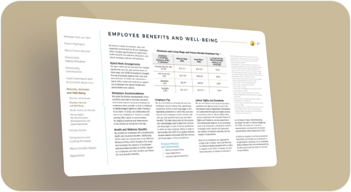 EMPLOYEE BENEFITS AND WELL-BEING 31 Message from our CEO Report Highlights We strive to create an inclusive, safe, and 1,2 supportive environment for all our employees, Minimum and Living Wage and Franco-Nevada Employee Pay 1 All dollar figures are in USD (or converted to USD as About Franco-Nevada which includes opportunities for hybrid work, at December 31, 2023) and are on a per-hour basis. health benefits and wellness allowances, and Jurisdiction; % of Franco-Nevada 2 All information current as of December 31, 2023, 3 % of Full-Time Minimum Wage Living Wage FTE Pay Exceeding unless otherwise specified. Responsible robust workplace policies and practices. Employees (FTEs) (US$) (US$) Minimum and 3 A living wage is a measure intended to represent the in Jurisdiction Living Wage remuneration received by a worker in a particular location Capital Allocation Hybrid Work Arrangements Canada (Toronto, ON) sufficient to afford a decent standard of living for the 4 5 worker and their family. Elements of a decent standard The way in which we live and work has changed 67.5% $12.51 $18.94 100% Community significantly over the past several years. In of living include food, water, housing, education, health care, transportation, clothing, and other essential needs, Contributions many ways, the COVID-19 pandemic changed USA (Colorado) 6 7 including provision for unexpected events. 10% $14.42 $29.23 100% 4 Source: https://www.ontario.ca/document/your-guide- the way employees balance their work and employment-standards-act-0/minimum-wage Good Governance and personal lives. In 2023, we maintained a Barbados 5 Source: https://www.ontariolivingwage.ca/ 8 9 6 hybrid office model and continue to support 20% $4.25 $8.90 100% Source: https://cdle.colorado.gov/dlss Shareholder Alignment our employees who require flexible and (as of January 1, 2024) Australia 7 Source: https://livingwage.mit.edu/counties/08035 personalized work options. 10 11 (as of February 14, 2024) 2.5% $15.59 $15.91 100% Diversity, Inclusion 8 Source: https://gisbarbados.gov.bb/download/ and Well-Being Workplace Accommodations minimum-wage-national-and-sectoral-minimum-wage- We value the diverse representation of our order-2021/ 9 Source: https://mywage.org/barbados/images/ Diversity and Inclusion workforce and seek to promote inclusivity Employee Pay Labour Rights and Standards living-wages/520300000/view Employee Benefits and remove barriers by accommodating our We are committed to ensuring that all of our We are committed to the fundamental labour 10 Source: https://www.fairwork.gov.au/pay-and-wages/ employees where possible so that no individual employees receive salaries that significantly standards and rights at work set out in the minimum-wages and Well-Being 11 Calculated as 60% of median full-time adult ordinary is disadvantaged relative to other members exceed the minimum and living wages in the International Labour Organization’s Declaration time earnings. Source: https://www.abs.gov.au/ Health, Safety and Security of our team. In 2022, we collaborated with applicable jurisdictions in which they work and on Fundamental Principles and Rights at Work. statistics/labour/earnings-and-working-conditions/ Human Rights, one of our employees in Toronto to modify that all such employees receive vacation pay, In accordance with our Human Rights Policy employee-earnings/aug-2023 Non-Discrimination, existing office space to accommodate sick pay and parental leave pay and other and as enshrined in the Canadian Charter of Anti-Harassment and for religious practices and observances benefits. The table above sets out the sources Rights and Freedoms, we are supportive of our company’s history. Notwithstanding, Equal Opportunity to be carried out during the work day. and methodologies used to determine minimum the fundamental freedoms of our employees we respect the right to collective bargaining and living wages in each of the four jurisdictions (and of all individuals), including the freedom (ILO C98), the protection of workers’ Climate Action Health and Wellness Benefits in which we have corporate offices in order to of thought, belief, opinion and expression, representatives and prevention of workers’ We provide our employees with comprehensive demonstrate that 100% of our global workforce the freedom of peaceful assembly and the representatives discrimination (ILO C135). Transparency and health and insurance benefits. Additionally, receives salaries that exceed both the minimum freedom of association. Guiding Principles 2023 marks our second year of our Wellness and living wages in those jurisdictions. In 2023, we adopted a new Disconnecting from Allowance Policy, which broadens the scope None of our employees are organized by Work Policy to formalize our commitment to About this ESG Report and increases the quantum of employees’ Related Policies a trade union or labour union and there are recognizing the importance of our employees’ wellness-related benefits to further support and Statements: no collective bargaining agreements in place ability to balance their work and personal lives, Appendices our employees and their families and allows • Wellness Allowance Policy in respect of our staff or company. As such, all while performing their duties to the best for more benefits flexibility. • Human Rights Policy there have been no strikes or lock-outs in of their abilities. • Disconnecting from Work Policy