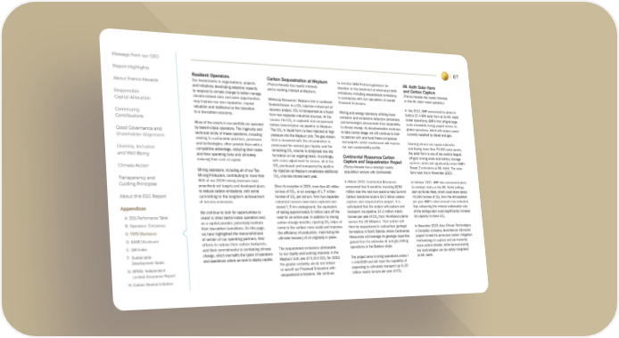 Message from our CEO 67 Report Highlights Resilient Operators Carbon Sequestration at Weyburn to monitor GHG Protocol guidance for Mt. Keith Solar Farm About Franco-Nevada Our investments in organizations, projects (Franco-Nevada has royalty interests direction on the treatment of eliminated GHG and Carbon Capture and initiatives developing adaptive capacity and a working interest at Weyburn) emissions, including sequestered emissions, (Franco-Nevada has royalty interests Responsible to respond to climate change to better manage in connection with our calculation of overall on the Mt. Keith nickel operation) Capital Allocation climate-related risks and seize opportunities Whitecap Resources’ Weyburn Unit in southeast Financed Emissions. may improve our own reputation, market Saskatchewan is a CO injection enhanced oil In July 2021, BHP announced its plans to 2 valuation and resilience to the transition recovery project. CO is transported as a liquid Mining and energy operators utilizing lower build a 27.4 MW solar farm at its Mt. Keith 2 Community to a low-carbon economy. from two separate industrial sources. At the emission and emissions reduction processes nickel operations, BHP’s first off-grid large- source, the CO is captured and compressed and technologies demonstrate their adaptability scale renewable energy project across its Contributions 2 Many of the assets in our portfolio are operated before transmission via pipeline to Weyburn. to climate change. As decarbonisation continues global operations, which will replace power by best-in-class operators. The ingenuity and The CO in liquid form is then injected at high to take centre stage, we will continue to look currently supplied by diesel and gas. Good Governance and 2 Shareholder Alignment technical skills of these operators, including pressure into the Weyburn Unit. The gas stream to partner with and fund these companies relating to sustainable practices, processes that is recovered with the oil production is and projects, which involvement will improve Covering almost one square kilometer and technologies, often provide them with a processed for natural gas liquids and the our own sustainability profile. and having more than 70,000 solar panels, Diversity, Inclusion competitive advantage, reducing their costs remaining CO volume is reinjected into the the solar farm is one of the world's largest 2 and Well-Being and their operating risks and ultimately formation on an ongoing basis. Accordingly, Continental Resources Carbon off-grid mining solar and battery storage reducing their cost of capital. with minor adjustment for losses, all of the Capture and Sequestration Project systems, which will significantly reduce BHP’s CO purchased and transported by pipeline (Franco-Nevada has a strategic royalty Scope 2 emissions at Mt. Keith. The solar Climate Action 2 Mining operators, including all of our Top for injection at Weyburn constitutes additional acquisition venture with Continental) farm went live in November 2023. Mining Producers, contributing to more than CO volumes stored each year. Transparency and 2 Guiding Principles 90% of our 2023 mining revenues have In March 2022, Continental Resources In October 2021, BHP also announced plans proactively set targets and developed plans Since its inception in 2000, more than 40 million announced that it would be investing $250 to conduct trials at the Mt. Keith tailings to reduce carbon emissions, with some tonnes of CO , or an average of 1.7 million million over the next two years to help Summit dam at Nickel West, which could store about 2 About this ESG Report committing to the long-term achievement tonnes of CO per annum, from two separate Carbon Solutions build a $4.5 billion carbon 40,000 tonnes of CO from the atmosphere 2 2 of net-zero emissions. industrial sources have been captured and capture and sequestration project. It is per year. BHP’s initial research has indicated Appendices stored 1.5 km underground, the equivalent anticipated that the project will capture and that enhancing the mineral carbonation rate We continue to look for opportunities to of taking approximately 8 million cars off the transport via pipeline 14.3 million metric of the tailings dam could significantly increase A: ESG Performance Table invest in other best-in-class operators and, road for an entire year. In addition to having tonnes per year of CO from 49 ethanol plants its capacity to store CO . 2 2 as a capital provider, potentially facilitate carbon storage benefits, injecting CO helps oil across the US Midwest. That carbon will B: Operators’ Emissions 2 their low-carbon transitions. On this page, come to the surface more easily and improves then be sequestered in subsurface geologic In November 2023, Area Climate Technologies, C: TCFD Disclosure we have highlighted the resourcefulness the efficiency of production, maximizing the formations in North Dakota, where Continental a Canadian company, launched an 18-month D: SASB Disclosure of certain of our operating partners, their ultimate recovery of oil originally in place. Resources will leverage its geologic expertise project to test its air-to-rock carbon mitigation E: GRI Index efforts to reduce their carbon footprints, gained from its extensive oil and gas drilling methodology to capture and permanently and their commitments to combating climate The sequestered emissions attributable operations in the Bakken shale. store carbon dioxide, while demonstrating F: Sustainable change, which exemplify the types of operators to our royalty and working interests in the the technologies can be safely integrated Development Goals and operations where we look to deploy capital. Weyburn Unit, are 274,314 tCO for 2022. The project aims to bring operations online i at Mt. Keith. 2 G: KPMG: Independent For greater certainty, we do not reduce n mid-2026 and will have the capability of Limited Assurance Report or set-off our Financed Emissions wit