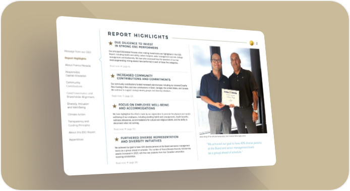 2 Message from our CEO Report Highlights About Franco-Nevada Responsible Capital Allocation Community Contributions Good Governance and Shareholder Alignment Diversity, Inclusion and Well-Being Climate Action Transparency and Guiding Principles About this ESG Report Appendices R E P O R T H I G H L I G H T S DUE DILIGENCE TO INVEST IN STRONG ESG PERFORMERS Our principal ESG-related focuses when making investments are highlighted in this ESG Report, including health and safety, carbon footprint, water management and risk, tailings management and biodiversity. We have also assessed how the operators of our top revenue-generating mining assets have performed in each of these five categories. Read more à (page 6) INCREASED COMMUNITY CONTRIBUTIONS AND COMMITMENTS Our community contributions funded increased year-over-year, including our renewed Enseña Peru funding in Peru and new contributions in Brazil, Senegal, the United States, and Canada. We continue to support mining industry groups and diversity initiatives. Read more à (page 19) FOCUS ON EMPLOYEE WELL-BEING AND ACCOMMODATIONS We have highlighted the efforts made by our organization to promote the physical and mental well-being of our employees, including providing hybrid work arrangements, health benefits, wellness allowances, accommodations for cultural and religious beliefs, and the ability to disconnect when not working. Read more à (page 31) FURTHERED DIVERSE REPRESENTATION AND DIVERSITY INITIATIVES We achieved our goal to have 40% diverse persons at the Board and senior management levels (as a group) ahead of schedule. The number of Franco-Nevada Diversity Scholarship awards increased in 2023, with five new students from four Canadian universities receiving scholarships. Read more à (page 28) Adrian Wong, VP Tax (left) and Sandip Rana, Chief Financial Officer (right) (2023) "We achieved our goal to have 40% diverse persons at the Board and senior management levels (as a group) ahead of schedule."