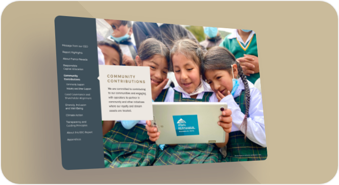 Message from our CEO Report Highlights About Franco-Nevada Responsible Capital Allocation Community COMMUNITY Contributions CONTRIBUTIONS Community Support Industry and Other Support We are committed to contributing Good Governance and to our communities and engaging Shareholder Alignment with operators to partner in community and other initiatives Diversity, Inclusion where our royalty and stream and Well-Being assets are located. Climate Action Transparency and Guiding Principles About this ESG Report Appendices Minera Antamina community contributions in Peru