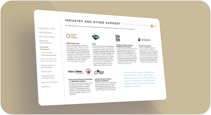 21 Message from our CEO Report Highlights About Franco-Nevada Responsible Capital Allocation Community Contributions Community Support Industry and Other Support Good Governance and Shareholder Alignment Diversity, Inclusion and Well-Being Climate Action Transparency and Guiding Principles About this ESG Report Appendices I N D U S T R Y A N D O T H E R S U P P O R T We provide ongoing support to several mining industry, diversity-related and other organizations and initiatives, some of which are described below. World Gold Council We are a proactive member of the World Gold Council (“WGC”) Board and, in 2019, Franco-Nevada played a leading role at the World Gold Council during the establishment of the RGMPs, which principles are being implemented by all World Gold Council members. Paul Brink, President & CEO of Franco-Nevada Corporation, is currently a director of the World Gold Council, and is the Chair of its Compensation Committee. Franco-Nevada Diversity Scholarship and BlackNorth Initiative We have several diversity and inclusion related contributions and initiatives, including our Franco-Nevada Diversity Scholarship for studies in mining-related fields and our BlackNorth Initiative pledge commitments. These are described on page 30 of this ESG Report. Canadian Mineral Industry Education Foundation In 2023, we supported the Canadian Mineral Industry Education Foundation, which has been offering scholarships since 1964 to undergraduate students with a strong interest in a career in the mining industry. Canadian Institute of Mining, Metallurgy and Petroleum In 2023, we supported the Canadian Institute of Mining, Metallurgy and Petroleum, which collaborates with other organizations to advance a more sustainable future for the mining industry, minimize duplication, and accelerate key industry issues and initiatives towards the development and advancement of standards and leading practices across the full spectrum of the minerals, metals, materials and energy sectors. Continental Resources In 2023, we funded the final year of our three-year commitment to help finance Continental Resources’ solar-powered water recycling project in Oklahoma. Through water recycling the Continental team materially reduces the amount of fresh water required for operations. By powering the facility with solar energy, they reduce emissions of the facility with the use of renewable energy as opposed to using energy from the grid. PDAC We are the primary sponsor of the Prospectors & Developers Association of Canada (“PDAC”) annual awards that recognize industry successes in exploration, development, safety, environmental stewardship and aboriginal cooperation and we are sponsors of PDAC's Mining Matters initiative. David Harquail, Chair of the Board of Franco-Nevada Corporation, is a PDAC board member and Eaun Gray, Senior Vice President, Business Development of Franco-Nevada Corporation, sits on the PDAC Convention Planning Committee. “We are a proactive member of the World Gold Council Board and, in 2019, Franco-Nevada played a leading role at the World Gold Council during the establishment of the RGMPs, which principles are being implemented by all World Gold Council members.” Diversity Scholarship