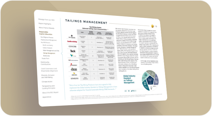 13 Message from our CEO Report Highlights About Franco-Nevada Responsible Capital Allocation Due Diligence Process Ongoing Asset Management Key ESG Factors Health and Safety Carbon Footprint Water Management and Risk Tailings Management Biodiversity Supply Chain Community Contributions Good Governance and Shareholder Alignment Diversity, Inclusion and Well-Being Climate Action Transparency and Guiding Principles About this ESG Report Appendices T A I L I N G S M A N A G E M E N T 1 Tailings data sourced from Global Tailings Portal and Vale S.A. reporting. 2 Vale S.A. figures include tailings, sediment dams and other similar internal structures. Many of Vale's tailings dams are compliant with the Global Industry Standard on Tailings Management, with additional dams scheduled to be compliant by 2025. 3 Tailings dams are on the entirety of the Northern and Southeastern Systems and not necessarily covered by Franco-Nevada’s effective royalty grounds. Includes dams undergoing decharacterization. Top Mining Assets: Selected Tailings Dam Characteristics 1, 2 Asset Number of active tailings dams Tailings dam types Classification system adopted Cobre Panamá (Panamá) 1 Downstream/ centreline hybrid (1) Canadian Dam Association Candelaria (Chile) 2 Downstream (2) SERNAGEOMIN DS 248/2007 and DGA Decreto 50 (2015), Chile Antapaccay (Peru) 1 Downstream (1) Global Industry Standard on Tailings Management Antamina (Peru) 1 Downstream/ centreline hybrid (1) Canadian Dam Association Northern and Southeastern Systems (Brazil) 3 49 Downstream (14), single step (23), upstream (12) Ordinance 70.389/17 - ANM (Mining National Agency), Brasil Guadalupe-Palmarejo (Mexico) 1 Downstream (1) Canadian Dam Association MWS (South Africa) 1 Upstream (1) SANS 10286, South Africa Stillwater (USA - Montana) 3 Downstream (3) US Army Corp of Engineers Detour Lake (Canada - Ontario) 1 Centreline (1) Canadian Dam Association Tasiast (Mauritania) 1 Downstream ring dyke (1) Canadian Dam Association “Nine of our ten Top Mining Producers have since agreed to fully implement the Global Industry Standard on Tailings Management or have otherwise adopted the Towards Sustainable Mining (TSM) framework...” With several major disasters occurring in the last decade, tailings dams have been under increased regulatory scrutiny and have triggered an international response. In 2019, the Church of England Pensions Board and the Council on Ethics of the Swedish National Pension Funds wrote to mining companies, requesting disclosure of details of their tailings storage facilities and identifying the lack of a global tailings management standard as one possible contributor to the recent disasters. The Global Industry Standard on Tailings Management (the “Global Standard”) was launched in August 2020, aimed towards the goal of zero harm. Nine of our ten Top Mining Producers have since agreed to fully implement the Global Standard or have otherwise adopted the Towards Sustainable Mining (TSM) framework, with the remaining one Top Mining Producer (Harmony Gold) implementing certain aspects of the Global Standard. Further, comprehensive information relating to all our Top Mining Assets’ tailings dams have been made publicly available by our Top Mining Producers and is available on the Global Tailings Portal ( tailing.grida.no ). Responsible tailings management requires operators to consider the management and governance of tailings storage facilities throughout their lifecycle, from design to closure and post-closure. When deciding where to deploy capital, depending on the stage of development of an applicable project, Franco-Nevada reviews all aspects of a project’s planned or existing waste and tailings storage facilities. When negotiating new royalty or stream acquisitions, we endeavour to negotiate contractual arrangements such that the operator commits to implement the Global Standard or another equivalent international tailings standard in respect to their tailings storage facilities and to provide Franco-Nevada with ongoing reporting with respect to adherence to such standards. On this page, we have highlighted certain attributes of the tailings storage facilities for our Top Mining Assets.