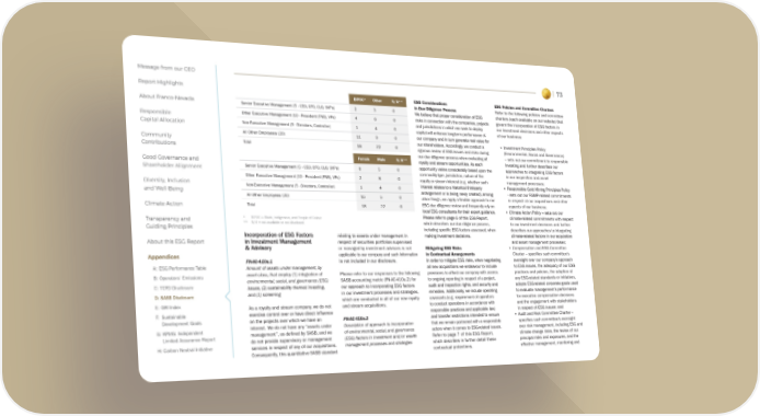 Message from our CEO 73 Report Highlights BIPOC* Other N/A** ESG Considerations ESG Policies and Committee Charters About Franco-Nevada in Due Diligence Process Refer to the following policies and committee Senior Executive Management (5 - CEO, CFO, CLO, SVPs) 2 3 0 We believe that proper consideration of ESG charters (each available on our website) that Responsible Other Executive Management (10 - President (FNB), VPs) 4 6 0 risks in connection with the companies, projects govern the incorporation of ESG factors in and jurisdictions in which we seek to deploy our investment decisions and other aspects Capital Allocation Non-Executive Management (5 - Directors, Controller) 1 4 0 capital will enhance long-term performance of of our business: All Other Employees (20) 11 9 0 our company and in turn generate real value for Community our shareholders. Accordingly, we conduct a • Investment Principles Policy Contributions Total 18 22 0 rigorous review of ESG issues and risks during (Environmental, Social and Governance) our due diligence process when evaluating all – sets out our commitment to responsible Good Governance and Female Male N/A** royalty and stream opportunities. As each investing and further describes our Shareholder Alignment Senior Executive Management (5 - CEO, CFO, CLO, SVPs) 0 5 0 opportunity varies considerably based upon the approaches to integrating ESG factors commodity-type, jurisdiction, nature of the in our acquisition and asset Other Executive Management (10 - President (FNB), VPs) 2 8 0 royalty or stream interest (e.g. whether such management processes; Diversity, Inclusion Non-Executive Management (5 - Directors, Controller) 1 4 0 interest relates to a historical third-party • Responsible Gold Mining Principles Policy and Well-Being arrangement or is being newly created), among - sets out our RGMP-related commitments All Other Employees (20) 15 5 0 other things, we apply a flexible approach to our in respect of our acquisitions and other Climate Action Total 18 22 0 ESG due diligence review and frequently rely on aspects of our business; local ESG consultants for their expert guidance. • Climate Action Policy – sets out our Transparency and * BIPOC = Black, Indigenous, and People of Colour Please refer to page 6 of this ESG Report, climate-related commitments with respect Guiding Principles ** N/A = not available or not disclosed which describes our due diligence process, to our investment decisions and further including specific ESG factors assessed, when describes our approaches to integrating Incorporation of ESG Factors relating to assets under management in making investment decisions. climate-related factors in our acquisition About this ESG Report in Investment Management respect of securities portfolios supervised and asset management processes; & Advisory or managed by investment advisors is not Mitigating ESG Risks • Compensation and ESG Committee Appendices applicable to our company and such information in Contractual Arrangements Charter – specifies such committee’s FN-AC-410a.1 is not included in our disclosure. In order to mitigate ESG risks, when negotiating oversight over our company’s approach A: ESG Performance Table Amount of assets under management, by all new acquisitions we endeavour to include to ESG issues, the adequacy of our ESG B: Operators’ Emissions asset class, that employ (1) integration of Please refer to our responses to the following provisions to afford our company with access practices and policies, the adoption of environmental, social, and governance (ESG) SASB accounting metric (FN-AC-410a.2) for to ongoing reporting in respect of a project, any ESG-related standards or initiatives, C: TCFD Disclosure issues, (2) sustainability themed investing, our approach to incorporating ESG factors audit and inspection rights, and security and adopts ESG-related corporate goals used D: SASB Disclosure and (3) screening in our investment processes and strategies, remedies. Additionally, we include operating to evaluate management’s performance E: GRI Index which are conducted in all of our new royalty covenants (e.g. requirement of operators for executive compensation decisions As a royalty and stream company, we do not and stream acquisitions. to conduct operations in accordance with and the engagement with stakeholders F: Sustainable exercise control over or have direct influence responsible practices and applicable law) in respect of ESG issues; and Development Goals on the projects over which we have an FN-AC-410a.2 and transfer restrictions intended to ensure • Audit and Risk Committee Charter – G: KPMG: Independent interest. We do not have any “assets under Description of approach to incorporation that we remain partnered with a responsible specifies such committee’s oversight Limited Assurance Report management”, as defined by SASB, and we of environmental, social, and governance actors when it comes to ESG-related issues. over risk management, including ESG and do not provide supervisory or management (ESG) factors in investment and/or wealth Refer to page 7 of this ESG Report, climate change risks, the review of our H: Carbon Neutral Initiative services in respect of any of our acquisitions. management processes and strategies which describes in further detail these principal risks and exposures, and the Consequently, this quantitative SASB standard contractual protections. effective management, monitoring and