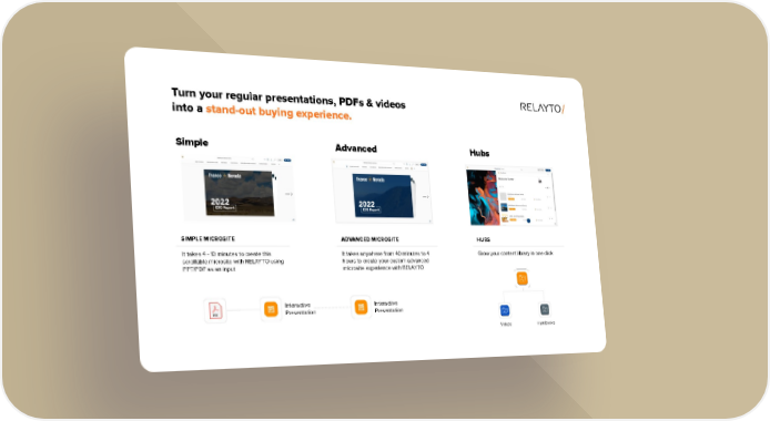 Turn your regular presentations, PDFs & videos into a stand-out buying experience. Simple Advanced Hubs SIMPLE MICROSITE ADVANCED MICROSITE HUBS It takes 4 - 10 minutes to create this It takes anywhere from 40 minutes to 4 Grow your content library in one click scrollable microsite with RELAYTO using hours to create your custom advanced PPT/PDF as an input microsite experience with RELAYTO Interactive Interactive Presentation Presentation Videos Handbooks