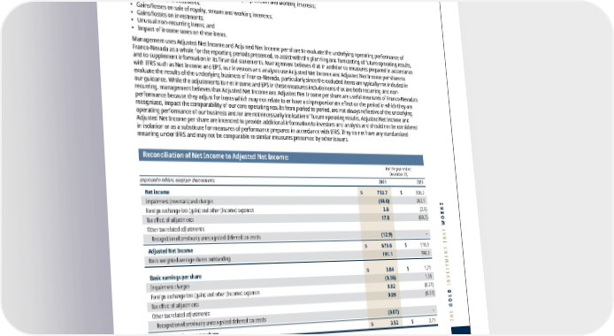 FRANCO-NEVADA CORPORATION 149 Additional Information ADDITIONAL INFORMATION THE GOLD INVESTMENT THAT WORKS Adjusted Net Income and Adjusted Net Income per share Adjusted Net Income and Adjusted Net Income per share are non-GAAP financial measures, which is defined by Franco-Nevada by excluding the following from net income (loss) and earnings (loss) per share: • Foreign exchange gains/losses and other income/expenses; • Impairment charges and reversals related to royalty, stream and working interests; • Impairment of investments; • Gains/losses on sale of royalty, stream and working interests; • Gains/losses on investments; • Unusual non-recurring items; and • Impact of income taxes on these items. Management uses Adjusted Net Income and Adjusted Net Income per share to evaluate the underlying operating performance of Franco-Nevada as a whole for the reporting periods presented, to assist with the planning and forecasting of future operating results, and to supplement information in its financial statements. Management believes that in addition to measures prepared in accordance with IFRS such as Net Income and EPS, our investors and analysts use Adjusted Net Income and Adjusted Net Income per share to evaluate the results of the underlying business of Franco-Nevada, particularly since the excluded items are typically not included in our guidance. While the adjustments to net income and EPS in these measures include items that are both recurring and non- recurring, management believes that Adjusted Net Income and Adjusted Net Income per share are useful measures of Franco-Nevada’s performance because they adjust for items which may not relate to or have a disproportionate effect on the period in which they are recognized, impact the comparability of our core operating results from period to period, are not always reflective of the underlying operating performance of our business and/or are not necessarily indicative of future operating results. Adjusted Net Income and Adjusted Net Income per share are intended to provide additional information to investors and analysts and should not be considered in isolation or as a substitute for measures of performance prepared in accordance with IFRS. They do not have any standardized meaning under IFRS and may not be comparable to similar measures presented by other issuers. Reconciliation of Net Income to Adjusted Net Income: For the year ended December 31, (expressed in millions, except per share amounts) 2021 2020 Net income $ 733.7 $ 326.2 Impairment (reversals) and charges (68.0 ) 262.1 Foreign exchange loss (gain) and other (income) expenses 3.0 (2.8 ) Tax effect of adjustments 17.8 (69.2 ) Other tax related adjustments: Recognition of previously unrecognized deferred tax assets (12.9 ) – Adjusted Net Income $ 673.6 $ 516.3 Basic weighted average shares outstanding 191.1 190.3 Basic earnings per share $ 3.84 $ 1.71 Impairment charges (0.36 ) 1.38 Foreign exchange loss (gain) and other (income) expenses 0.02 (0.01 ) Tax effect of adjustments 0.09 (0.37 ) Other tax related adjustments: Recognition of previously unrecognized deferred tax assets (0.07 ) – Adjusted Net Income per share $ 3.52 $ 2.71