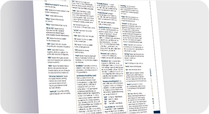FRANCO-NEVADA CORPORATION 147 THE GOLD INVESTMENT THAT WORKS “ MMcf/mmcf ” means million cubic feet. “ MMcf/d or mmcf/d ” means million cubic feet per day. “ Mo ” means the chemical symbol for the element molybdenum. “ Moz ” means million ounces. “ Mtpa ” means million tonnes per annum. “ NGLs ” means Natural Gas Liquids. “ NI 43-101 ” means National Instrument 43-101 - Standards of Disclosure for Mineral Projects of the Canadian Securities Administrators . “ Ni ” means the chemical symbol for the element nickel. “ NPI ” means Net Profit Interest: the profits after deduction of expenses. “ NPR ” means Net Proceeds Royalties: which is a royalty on the profits after deduction of expenses. “ NRI ” means Net Royalty Interest: paid net of operating and capital costs (similar to an NPI). “ NSR ” means Net Smelter Return: Which is the proceeds returned from the smelter and/or refinery to the mine owner less certain costs. “ Oil & Gas Interests ” means the royalty interests, working interests and oil and natural gas mineral rights in oil and natural gas properties owned by Franco-Nevada. “ open pit ” is a surface working open to daylight, such as a quarry. “ ore ” means a natural aggregate of one or more minerals which may be mined and sold at a profit, or from which some part may be profitably separated. “ ORR ” means Overriding Royalty: A percentage share of production, which is free of all costs of drilling and producing, and is created by the lessee or working interest owner and paid by the lessee or working interest owner. “ oz ” represents ounce (troy). 1 troy ounce = 1.097 avoirdupois ounce. “ oz/ton ” represents troy ounces per short ton. “ P&P ” means Proven and Probable. “ Pb ” means the chemical symbol for the element lead. “ Pd ” means the chemical symbol for the element palladium. “ PFS ” means preliminary feasibility study. “ PGM ” means the platinum group of metals, including but not limited to Palladium, Platinum, Rhodium, Osmium, and Rhenium. “ porphyry ” is an igneous rock of any composition that contains conspicuous, large mineral grains (phenocrysts) in a fine-grained matrix. “ preliminary feasibility study ” means a comprehensive study of the viability of a mineral project that has advanced to a stage where the mining method, in the case of underground mining, or the pit configuration, in the case of an open pit, has been established and an effective method of mineral processing has been determined, and includes a financial analysis based on reasonable assumptions of technical, engineering, legal, operating, economic, social, and environmental factors and the evaluation of other relevant factors which are sufficient for a qualified person, acting reasonably, to determine if all or part of the mineral resource may be classified as a mineral reserve. “ Probable Reserve ” in respect of Mineral Reserves has the meaning ascribed to the term “probable mineral reserve” pursuant to CIM Definitions. “ Proven Reserve ” in respect of Mineral Reserves has the meaning ascribed to the term “proven mineral reserve” pursuant to CIM Definitions. “ Pt ” means the chemical symbol for the element platinum. “ Qualified Person ” for the purposes of NI 43-101, is an individual who is an engineer or geoscientist with at least five years of experience in mineral exploration, mine development or operation or mineral project assessment, or any combination of these; and has experience relevant to the subject matter of the mineral project; and who is a member in good standing of a recognized self-regulatory organization of engineers or geoscientists. “ Reserves ” means collectively, in respect of Mineral Reserves, Probable Reserves and Proven Reserves. “ Resources ” means a concentration or occurrence of diamonds, natural solid inorganic material, or natural solid fossilized organic material including base and precious metals, coal, and industrial minerals in or on the earth’s crust in such form and quantity and of such a grade or quality that it has reasonable prospects for economic extraction. “ Revenue-based Royalties ” are based on the value of the production or net proceeds received by the operator with defined deductions as specified by the royalty contract. Some forms of revenue-based royalties in the mining and energy industries are: “ NSR ” Net Smelter Return Royalty “ ORR ” Overriding Royalty “ GR ” Gross Royalty “ FH ” Freehold or Lessor Royalty “ run-of-mine ore ” means mined ore which has not been subjected to any pre-treatment, such as washing, sorting or crushing prior to metallurgical processing. “ SAMREC ” means the South African Code for Reporting of Mineral Resources and Mineral Reserves prepared by the South African Mineral Committee under the auspices of the South African Institute of Mining and Metallurgy, as amended. “ smelting ” is an intermediate stage metallurgical process in which metal is separated from impurities by using thermal or chemical separation techniques. “ stope ” means an excavation in an underground mine from which ore is being or has been extracted. “ Streams ” are metal purchase agreements that allow the holder of the agreement to purchase all or a portion of the gold, silver or other products from a mine in exchange for an upfront payment and an additional payment on each delivery. Streams are not royalties because they are not an interest in land and there is an ongoing cash payment required to purchase the physical metal. “ strike ” means the trend or direction of the intersection of a dipping a layer of rock, fault, vein or other geologic feature with a horizontal surface. “ tailings ” means material rejected after recoverable valuable minerals have been extracted from the ore or concentrate. “ ton ” is 2,000 pounds. Syn: short ton. “ tonne ” means 1,000 kilograms. “ t