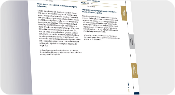 FRANCO-NEVADA CORPORATION 47 THE GOLD INVESTMENT THAT WORKS Other South America Assets South America Precious Metals Please refer to the tables on pages 128-136 for a breakout of grade and tonnages by Mineral Resource category. Franco-Nevada has a 2.5% NSR on the Calcatreu property in Argentina. Calcatreu is an epithermal gold-silver deposit located in the Province of Rio Negro. In December 2017, Patagonia Gold PLC (“Patagonia”) acquired the property from Pan American Silver Corp. (“Pan American Silver”). The Calcatreu deposit contains an Indicated Mineral Resource of 669,000 ounces of gold and 6.3 million ounces of silver (9.8 million tonnes grading 2.11 g/t gold and 19.83 g/t silver) and an Inferred Mineral Resource of 348,000 ounces of gold and 3.4 million ounces of silver (8.1 million tonnes grading 1.34 g/t gold and 13.09 g/t silver). Field work for a baseline environmental study continued in 2021, along with drilling, surface exploration and geophysics. Additional work, including new trenching and sampling, is planned to follow-up on positive geochemical results and a new ground magnetic survey was conducted in the southern part of the project. Exploration activities on the property have continued to move the project forward in 2021 and Patagonia's objective is for the completion of a prefeasibility study in 2022. For Royalty Ounce calculation, Franco-Nevada estimates 100% of Mineral Reserves and Mineral Resources are subject to our royalty interest and estimates an average rate of 2.5% is applicable Calcatreu Au & Ag Argentina, South America Operator: Patagonia Gold PLC Royalty: NSR: 2.5% Precious Metals San Jorge is a copper-gold porphyry project located in the Province of Mendoza, Argentina. Although the project is currently on care and maintenance, under the revised terms of the royalty agreement Franco-Nevada received annual payments of $1.25 million per year for a 10-year period which ended in 2021, with a subsequent 7.5% NSR on all gold produced from the property. Aterra Investments Ltd. and Solway Industries Ltd. acquired the property from Coro Mining Corp. in April 2015. Franco-Nevada acquired the royalty on the San Jorge property through its acquisition of Lumina Royalty Corp. in December 2011. For Royalty Ounce calculation, Franco-Nevada estimates 100% of Mineral Reserves and Mineral Resources are subject to our royalty interest and estimates an average rate of 7.5% is applicable San Jorge Au Argentina, South America Operator: Aterra Investments Ltd. and Solway Industries Ltd. Royalty: NSR: 7.5% Precious Metals South America PRECIOUS METALS DIVERSIFIED ASSETS RESERVES AND RESOURCES ADDITIONAL INFORMATION
