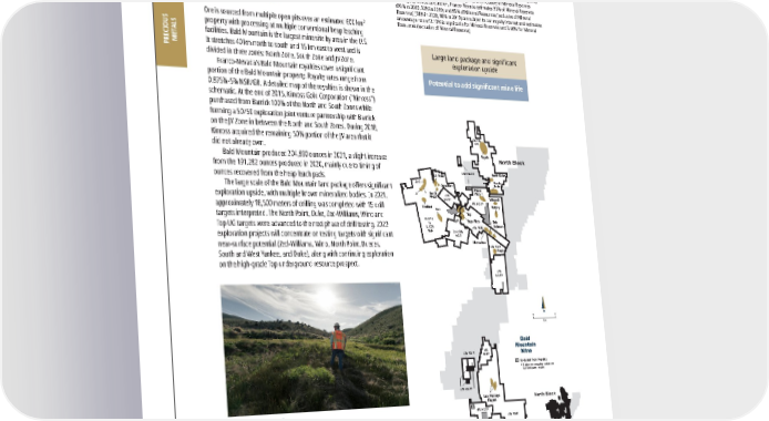 2022 ASSET HANDBOOK 58 FNV TSX NYSE Bald Mountain Mine North Block South Block Excluded from Royalty * Subject to possible reduction by third-party royalty Galaxy Poker Flats Bida Saga Yankee Targets Lux/Vantage Targets Top Sage Flats Belmont Horseshoe 4% NSR 4% NSR 4% NSR 4% NSR 4% NSR* 4% NSR* 4% NSR* 4% NSR* 4% NSR* 4% NSR* 4% NSR* 0.875 to 1.75% NSR 2.418% NSR Royale 1%-5% GR Redbird 5 1 LJ Ridge Banghart South Ridge Rat North Duke South Duke 2/3 1%-5% GR Winrock N Km 0 2 North Block South Block Bald Mountain Mine North Block South Block Excluded from Royalty * Subject to possible reduction by third-party royalty Galaxy Poker Flats Bida Saga Yankee Targets Lux/Vantage Targets Top Sage Flats Belmont Horseshoe 4% NSR 4% NSR 4% NSR 4% NSR 4% NSR* 4% NSR* 4% NSR* 4% NSR* 4% NSR* 4% NSR* 4% NSR* 0.875 to 1.75% NSR 2.418% NSR Royale 1%-5% GR Redbird 5 1 LJ Ridge Banghart South Ridge Rat North Duke South Duke 2/3 1%-5% GR Winrock N Km 0 2 North Block South Block Bald Mountain Pacific Ocean Oregon Idaho Utah Nevada California Arizona MEXICO United States PRECIOUS METALS 2021 2020 2019 Revenue to Franco-Nevada ($ million) $ 11.2 $ 11.2 $ 8.9 P&P Reserves (koz Au) 1 798 1,143 1,277 M&I Resource (koz Au) 1 4,390 4,735 5,139 Inferred Resource (koz Au) 1 669 695 808 P&P Royalty Ounces (000s) 2 16 22 25 M&I Royalty Ounces (000s) 1, 2 139 143 161 Inf Royalty Ounces (000s) 2 23 23 29 1 Please refer to the tables on pages 128-136 for a breakout of grade and tonnages by Mineral Resource category; all M&I categories are inclusive of Mineral Reserves 2 For Royalty Ounce calculation, Franco-Nevada estimates 95% of Mineral Reserves (93% in 2020, 92% in 2019) and 95% of Mineral Resources (exclusive of Mineral Reserves) (93% in 2020, 98% in 2019) are subject to our royalty interest and estimates an average rate of 2.10% is applicable for Mineral Reserves and 3.60% for Mineral Resources (exclusive of Mineral Reserves) Bald Mountain Au Nevada, United States Operator: Kinross Gold Corporation Royalty: NSR/GR: 0.875-5% Precious Metals The Bald Mountain mine lies within the Southern Ruby Mountains of northeastern Nevada along the southern extension of the prolific Carlin Trend, approximately 110 km southeast of Elko. Ore is sourced from multiple open pits over an estimated 600 km 2 property with processing at multiple conventional heap leaching facilities. Bald Mountain is the largest mine site by area in the U.S. It stretches 40 km north to south and 15 km east to west and is divided in three zones: North Zone, South Zone and JV Zone. Franco-Nevada’s Bald Mountain royalties cover a significant portion of the Bald Mountain property. Royalty rates range from 0.875%-5% NSR/GR. A detailed map of the royalties is shown in the schematic. At the end of 2015, Kinross Gold Corporation (“Kinross”) purchased from Barrick 100% of the North and South Zones while forming a 50/50 exploration joint venture partnership with Barrick on the JV Zone in between the North and South Zones. During 2018, Kinross acquired the remaining 50% portion of the JV area that it did not already own. Bald Mountain produced 204,890 ounces in 2021, a slight increase from the 191,282 ounces produced in 2020, mainly due to timing of ounces recovered from the heap leach pads. The large scale of the Bald Mountain land package offers significant exploration upside, with multiple known mineralized bodies. In 2021, approximately 18,500 meters of drilling was completed with 15 drill targets interpreted. The North Point, Duke, Zed-Williams, Wino and Top UG targets were advanced to the next phase of drill testing. 2022 exploration projects will concentrate on testing targets with significant near-surface potential (Zed-Williams, Wino, North Point, Dueces, South and West Yankee, and Duke), along with continuing exploration on the high-grade Top underground resource prospect. Large land package and significant exploration upside Potential to add significant mine life Bald Mountain, Nevada