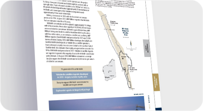 FRANCO-NEVADA CORPORATION 113 THE GOLD INVESTMENT THAT WORKS DIVERSIFIED ASSETS RESERVES AND RESOURCES ADDITIONAL INFORMATION Diversified Assets – Other Mining 2021 2020 2019 Revenue to Franco-Nevada ($ million) $ 2.3 $ 1.2 $ 1.7 P&P Reserves (Mlbs Ni) 1 1,087 1,135 1,187 M&I Resource (Mlbs Ni) 1 2,390 2,442 2,452 Inferred Resource (Mlbs Ni) 1 275 275 275 P&P Royalty Ounces (000s) 2 19 16 22 M&I Royalty Ounces (000s) 1, 2 42 34 44 Inf Royalty Ounces (000s) 2 5 4 5 1 Please refer to the tables on pages 128-136 for a breakout of grade and tonnages by Mineral Resource category; all M&I categories are inclusive of Mineral Reserves 2 For Royalty Ounce calculation, Franco-Nevada estimates 100% of the Mineral Reserves and Mineral Resources are subject to our royalty interest and estimates a rate of 0.50% is applicable. Franco-Nevada has also applied a NSR smelting charge of 30%. Nickel has been converted to Royalty Ounces assuming $9.00 per pound ($7.00 per pound in 2020, $7.25 per pound in 2019) Mt Keith Ni Australia, Rest of World Operator: BHP Billiton Limited Royalty: NPI: 0.25% / GR: 0.375% Diversified Franco-Nevada has a 0.375% gross royalty and a 0.25% NPI royalty on lands including the Mt Keith nickel operation in Western Australia, located 460 km north of Kalgoorlie. BHP Billiton Limited (“BHP Billiton”) is the operator and the project is a large, low-grade disseminated nickel sulphide ore body with an open-pit mine. Franco-Nevada’s royalties cover 236 km 2 and includes the Jericho Nickel Deposit located approximately 25 km northwest of Mt Keith, and covers part of the Yakabindie Deposits located approximately 25 km south of Mt Keith. Mining commenced in 1993 with the first nickel concentrate produced in 1994. In June 2021, BHP Billiton reported that Mt Keith had an estimated mine life of 15 years. Mt Keith concentrator ore throughput is approximately 11.5 Mtpa with 64% recoveries. Production capacity is 35,000-40,000 tonnes per annum of nickel in concentrate. Mt Keith is part of Nickel West, BHP Billiton’s integrated business unit for Australian nickel assets, along with four other mines, a concentrator, a smelter and a refinery. BHP Billiton reported that Mt Keith total production for 2021 was 27,943 tonnes of nickel. During 2019, BHP Billiton developed the Goliath and Six Mile Well Nickel Deposits at Yakabindie as satellite operations. Franco-Nevada’s royalty does not cover Goliath or the southern half of Six Mile Well. It is estimated that royalty area production accounted for 84% of Mt Keith total production in 2021. Yakabindie satellite deposits are expected to provide the majority of ore to the Mt Keith concentrator going forward. In August 2018, BHP Billiton commenced a concept study to expand the Mt Keith concentrator to 50,000 tonnes per annum of nickel in concentrate. 15-year mine life at Mt Keith Yakabindie satellite deposits developed in 2019 - largely outside royalty area Study to expand Mt Keith concentrator to 50,000 tonnes per annum Exploration upside on large land package N Albion Downs Jericho Mt Keith Cliffs Yakabindie Kingston Royalty Area Total: 236.5 km 2 122.5 km 2 Mt Keith Kingston Royalty Area Perth Wiluna Port Hedland Kalgoorlie Mt Keith Royalty Area 114 km 2 Kilometres O 5 10 Mt Keith, Australia