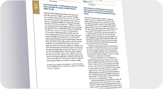 2022 ASSET HANDBOOK 80 FNV TSX NYSE PRECIOUS METALS Canada Other Canada Assets Canada Precious Metals Please refer to the tables on pages 128-136 for a breakout of grade and tonnages by Mineral Resource category. Franco-Nevada holds a 1% NSR on the past-producing Eskay Creek gold-silver project in British Columbia’s Golden Triangle. Eskay Creek was the highest-grade gold mine in the world when in production, producing 3.3 million ounces of gold and 160 million ounces of silver at average grades of 45 g/t gold and 2,224 g/t silver from 1994-2008. In July 2021, Skeena Resources Limited (“Skeena”) announced a positive prefeasibility study, outlining average annual production of 249,000 ounces of gold and 7.2 million ounces of silver over a 10-year mine life. The prefeasibility study indicated a high-grade open-pit with Proven and Probable Mineral Reserves of 3.88 Moz AuEq (26.4 Mt at 3.37 g/t Au and 94 g/t Ag) and a mill throughput of 7,945 tpd with a flotation plant producing saleable concentrate. Skeena anticipates further increases to the annual production profile as part of a feasibility study expected in 2022. In December 2021, Franco-Nevada entered into an agreement with Skeena to amend the terms of its existing 1% NSR royalty agreement such that the existing royalty will cover substantially all of the Eskay Creek gold-silver project land package, including all currently-known mineralized zones. Franco-Nevada was also granted by Skeena a right of first refusal over the sale of a 0.5% NSR royalty on Eskay Creek. If Skeena has not sold the 0.5% NSR royalty by October 2, 2023, Franco-Nevada will have the right to purchase this royalty for C$22.5 million. In January 2022, Skeena released positive exploration results with the discovery of the 23 Zone and, in March 2022, announced the 21A West Zone Expansion discovery, both of which are covered by Franco-Nevada’s royalty. For Royalty Ounce calculation, Franco-Nevada estimates 100% of the Mineral Reserves and Mineral Resources are subject to our royalty interest and estimates a rate of 1% is applicable Eskay Creek Au & Ag British Columbia, Canada Operator: Skeena Resources Limited Royalty: NSR: 1% Precious Metals Franco-Nevada has a 2% NSR (subject to a buy-back of 0.5%) on the water claims, which cover the majority of Mineral Reserves, of the Bateman gold project in Red Lake, Ontario. In July 2020, Rubicon Minerals Corp. (“Rubicon”) completed its corporate name change to Battle North Gold Corporation (“Battle North”), while also changing the name of the Phoenix gold project to the Bateman gold project. In May 2021, Evolution Mining Limited (“Evolution Mining”) announced the completion of its acquisition of Battle North. Under Evolution Mining, Bateman is being reported under Red Lake for public reporting purposes (Franco-Nevada does not have a royalty on Evolution Mining’s other Red Lake properties). The consolidated operation will consist of the Lower Red Lake, Upper Campbell, Cochenour and McFinley mining areas that will provide ore to the Campbell, Red Lake and Bateman mills with a total processing capacity target of two million tonnes by 2026. Ore from the deposits not covered by Franco-Nevada’s royalty will likely be higher priority through the mills in the short to medium term. The Bateman project is located 10 km north of Evolution Mining’s Red Lake mine. In November 2015, Rubicon announced a temporary shutdown of underground activities to enhance its geologic model and develop an implementation plan as the gold mineralization was more geologically complex than anticipated. This included a material reduction to the contained gold ounces estimated. In October 2020, Battle North announced feasibility study results for the Bateman gold project. The base case study outlined life of mine payable gold production of 602,987 ounces, averaging 73,835 ounces per year for 8.2 years from initial production. Of the 8.2 years, 7 years were classified as commercial production, which the company defined as an average of 70% of the 1,250 tpd permitted capacity, over 90 consecutive days. The project contemplated an 1,800 tpd mill with excess capacity for potential incremental tonnes from F2, McFinley and Pen Zones (contemplating 2,500 tpd for the expanded mill). The 1,800 tpd mill was constructed in 2015 prior to shut down and is currently permitted to 1,250 tpd. Evolution Mining anticipates that the Battle North acquisition will enable growth plans to be accelerated at Red Lake. The acquisition also provides Evolution Mining the opportunity to build on its track record as a safe and sustainable operator for the long-term benefit of a broad range of stakeholders including the local workforce, regional communities and the Wabauskang and Lac Seul First Nation Partners. For Royalty Ounce calculation, Franco-Nevada estimates 100% of the Mineral Reserves and Mineral Resources are subject to our royalty interest and estimates a rate of 1.5% is applicable in anticipation that Evolution Mining exercises its right to repurchase 0.5% of the 2.0% NSR Red Lake (Bateman) Au Ontario, Canada Operator: Evolution Mining Limited Royalty: NSR: 2% Precious Metals