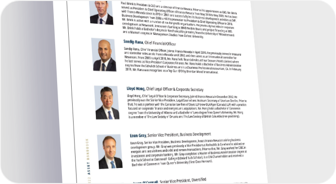 144 FNV TSX NYSE ADDITIONAL INFORMATION 2022 ASSET HANDBOOK EXECUTIVE MANAGEMENT Additional Information Paul Brink , President & CEO Paul Brink is President & CEO and a director of Franco-Nevada. Prior to his appointment as CEO, Mr. Brink served as President & Chief Operating Officer of Franco-Nevada from May 2018 to May 2020. He has been with Franco-Nevada since its IPO in 2007 and successfully led its business development activities as SVP, Business Development from 2008 until his promotion to President & Chief Operating Officer in 2018. Mr. Brink is active with a number of not-for-profit organizations. He previously had roles in corporate development at Newmont, investment banking at BMO Nesbitt Burns and project financing at UBS. Mr. Brink holds a Bachelor’s degree in Mechanical Engineering from the University of Witwatersrand and a Master’s degree in Management Studies from Oxford University. Sandip Rana , Chief Financial Officer Sandip Rana, Chief Financial Officer, joined Franco-Nevada in April 2010. He previously served in treasurer and controller roles at old Franco-Nevada until 2002 and then acted as an international controller for Newmont. From 2003 to April 2010, Mr. Rana held financial roles at Four Seasons Hotels Limited where he last served as Vice-President Corporate Finance. Mr. Rana holds a Bachelor of Business Administration degree from the Schulich School of Business and is a Chartered Professional Accountant, CA. In February 2019, Mr. Rana was recognized as a Top Gun CFO by Brendan Wood International. Lloyd Hong , Chief Legal Officer & Corporate Secretary Lloyd Hong, Chief Legal Officer & Corporate Secretary, joined Franco-Nevada in December 2012. He previously was the Senior Vice‐President, Legal Counsel and Assistant Secretary of Uranium One Inc. Prior to that, he was a partner with the Canadian law firm of Davis LLP (now DLA Piper (Canada) LLP) with a practice focused on corporate finance and mergers and acquisitions. Mr. Hong holds a Bachelor of Commerce degree from the University of Alberta and a Bachelor of Laws degree from Queen’s University. Mr. Hong is a member of The Law Society of Ontario and The Law Society of British Columbia (non-practising). Eaun Gray , Senior Vice President, Business Development Eaun Gray, Senior Vice President, Business Development, heads Franco-Nevada’s mining business development group. Mr. Gray was previously a Vice President at Rothschild & Co where he advised on mergers and acquisitions and debt and stream transactions. Prior to that, Mr. Gray worked for CIBC in investment and corporate banking. Mr. Gray completed a Master of Business Administration degree at the Tuck School at Dartmouth College (Edward Tuck Scholar), is a CFA Charterholder and received a Bachelor of Commerce from Queen’s University (First Class Honours). Jason O’Connell , Senior Vice President, Diversified Jason O’Connell, Senior Vice President, Diversified, has been with Franco-Nevada since 2008. His role includes leading business development activities for diversified mining and energy opportunities and managing the company’s Energy portfolio. Mr. O’Connell led the growth of the company’s US Energy portfolio and prior to that held roles in the business development group and managed investor relations. Prior to joining Franco-Nevada, he worked in mining equity research with the Bank of Montreal. Mr. O’Connell holds a Master of Business Administration degree from Dalhousie University and Bachelor of Science degree with honours in Geology from Acadia University.