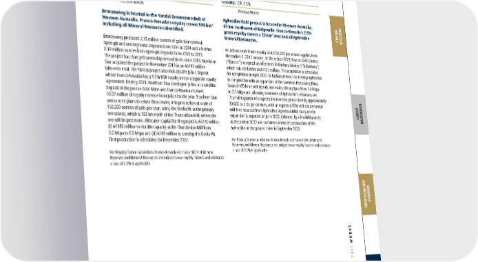 FRANCO-NEVADA CORPORATION 95 THE GOLD INVESTMENT THAT WORKS Aphrodite Gold project is located in Western Australia, 65 km northwest of Kalgoorlie. Franco-Nevada’s 2.5% gross royalty covers a 29 km 2 area and all Aphrodite Mineral Resources. An advance minimum royalty of A$250,000 per annum applies from November 1, 2017 onward. In December 2021, Bardoc Gold Limited (“Bardoc”) accepted an offer from St Barbara Limited (“St Barbara”) which valued Bardoc at A$157 million. The acquisition is scheduled for completion in April 2022. St Barbara intends to develop Aphrodite in conjunction with an expansion of the Laverton Processing Plant, located 180 km north by rail, increasing throughput from 1.4 Mtpa to 2.1 Mtpa and allowing treatment of Aphrodite’s refractory ore. The mill expansion is expected to increase production by approximately 90,000 ounces per annum, with an expected 80% of the incremental mill feed sourced from Aphrodite. A prefeasibility study on the expansion is expected in June 2022, followed by a feasibility study in December 2022 and commencement of construction of the Aphrodite underground mine in September 2023. For Royalty Ounce calculation, Franco-Nevada estimates 100% of Mineral Reserves and Mineral Resources are subject to our royalty interest and estimates a rate of 2.5% is applicable Aphrodite Au Australia, Rest of World Operator: Bardoc Gold Limited Royalty: GR: 2.5% Precious Metals Bronzewing is located in the Yandal Greenstone Belt of Western Australia. Franco-Nevada’s royalty covers 590 km 2 including all Mineral Resources identified. Bronzewing produced 2.19 million ounces of gold from several open-pit and underground deposits from 1994 to 2004 and a further 0.19 million ounces from open-pit deposits from 2010 to 2013. The project has changed ownership several times since 2013. Northern Star acquired the project in November 2019 in an A$193 million take-over deal. The Yandal project also includes the Julius deposit where Franco-Nevada has a 1.5% NSR royalty under a separate royalty agreement. During 2021, Northern Star developed Julius as a satellite deposit of the Jundee Gold Mine and Franco-Nevada received $0.07 million of royalty revenue from Julius for the year. Northern Star announced plans to return Bronzewing into production at a rate of 150,000 ounces of gold per year, using the Orelia Pit as the primary ore source, which is 100 km north of the Thunderbox Mill, where the ore will be processed. Allocated capital for the project is A$270 million; (i) A$180 million to double capacity at the Thunderbox Mill from 3.0 Mtpa to 6.0 Mtpa and (ii) A$90 million to develop the Orelia Pit. First production is scheduled for December 2022. For Royalty Ounce calculation, Franco-Nevada estimates 100% of Mineral Reserves and Mineral Resources are subject to our royalty interest and estimates a rate of 2.0% is applicable Yandal (Bronzewing) Au Australia, Rest of World Operator: Northern Star Resources Limited Royalty: NSR: 2% Precious Metals PRECIOUS METALS DIVERSIFIED ASSETS RESERVES AND RESOURCES ADDITIONAL INFORMATION Rest of World Other Rest of World Assets Rest of World Precious Metals Please refer to the tables on pages 128-136 for a breakout of grade and tonnages by Mineral Resource category.