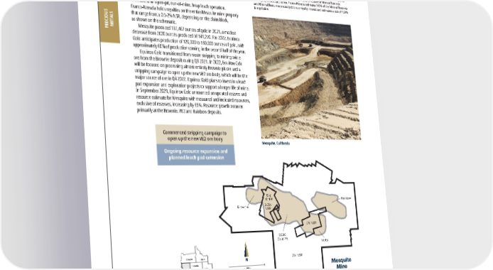 2022 ASSET HANDBOOK 60 FNV TSX NYSE United States PRECIOUS METALS 2021 2020 2019 Revenue to Franco-Nevada ($ million) $ 4.4 $ 4.2 $ 2.8 P&P Reserves (koz Au) 1 471 658 1,004 M&I Resource (koz Au) 1 1,924 1,571 2,902 Inferred Resource (koz Au) 1 928 752 184 P&P Royalty Ounces (000s) 2 8 11 16 M&I Royalty Ounces (000s) 1, 2 31 25 46 Inf Royalty Ounces (000s) 2 15 12 3 1 Please refer to the tables on pages 128-136 for a breakout of grade and tonnages by Mineral Resource category; all M&I categories are inclusive of Mineral Reserves 2 For Royalty Ounce calculation, Franco-Nevada estimates 100% of the Mineral Reserves and Mineral Resources are subject to our royalty interest and estimates a rate of 1.60% is applicable Mesquite Au California, United States Operator: Equinox Gold Corp. Royalty: NSR: 0.5-2% Precious Metals Mesquite is a gold operation located in south-east California, approximately 70 km northwest of Yuma, Arizona and 230 km east of San Diego, California. The mine is an open-pit, run-of-mine, heap leach operation. Franco-Nevada holds royalties on the entire Mesquite mine property that range from a 0.5-2% NSR, depending on the claim block, as shown on the schematic. Mesquite produced 137,467 ounces of gold in 2021, a modest decrease from 2020 ounces produced of 141,270. For 2022, Equinox Gold anticipates production of 120,000 to 130,000 ounces of gold, with approximately 60% of production coming in the second half of the year. Equinox Gold transitioned from waste stripping to mining oxide ore from the Brownie deposit during Q3 2021. In 2022, Equinox Gold will be focused on processing almost entirely Brownie pit ore and a stripping campaign to open up the new VE2 ore body, which will be the major source of ore in Q4 2022. Equinox Gold plans to invest in a leach pad expansion and exploration projects to support a longer life of mine. In September 2021, Equinox Gold announced an updated reserve and resource estimate for Mesquite with measured and indicated resources, exclusive of reserves, increasing by 65%. Resource growth occurred primarily at the Brownie, VE2 and Rainbow deposits. Commenced stripping campaign to open up the new VE2 ore body Ongoing resource expansion and planned leach pad extension N Mesquite Mine Big Chief Rainbow Vista $500 Gold Pit 2% NSR 0.5% NSR Brownie 1% NSR 1 Mile Mesquite Pacific Ocean Oregon Idaho Utah Nevada California Arizona MEXICO Mesquite, California