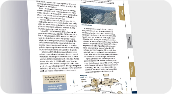 FRANCO-NEVADA CORPORATION 67 THE GOLD INVESTMENT THAT WORKS Quebec Ontario Detour Lake Royalty Area 2% NSR 0.5-1% NSR Mine Property Block D N Km O 2.5 5 West Pit Gowest Property Main Pit Other Quebec royalty claims not shown Block E Zone 58N Block A Block B Block C North Pit Sunday Lake Deformation Zone Lower Detour Lake Deformation Zone Sunday Lake Deformation Zone North Pit Main Pit West Pit Detour Mine Trend Saddle Zone Detour Lake Mine Km O 1 D Reser ve Pit Outline Resource Pit Outline Current Pit Outline Current Pit Outline Detour Lake Quebec Ontario Island Gold Millmerran Red October Henty Mt Keith Duketon Yandal (Bronzewing/Julius) King Vol Bowen Basin South Kalgoorlie (Mt Martin) Flying Fox Australia Subika (Ahafo) Tasiast Sabodala Edikan MWS Perama Hill Kiziltepe Karma Sissingue Pandora Courageous Lake Musselwhite Hemlo Detour Lake Goldfields Timmins West Sudbury Kirkland Lake Golden Highway Canadian Malartic Cariboo Dublin Gulch (Eagle) Red Mountain Franco-Nevada Australia Office Valentine Lake Red Lake (Bateman) Agate Creek White Dam Séguéla Edna May Higginsville (Lake Cowan) Aphrodite Matilda (Wiluna) Agnew (Vivien) South Kalgoorlie (New Celebration/ Mt Marion Lithium) Cue Gold (Day Dawn) Agi Dagi ̆ ̆ Producing Advanced Producing (Energy) Greenstone (Hardrock) Monument Bay Brucejack Eskay Creek Producing Advanced PRECIOUS METALS DIVERSIFIED ASSETS RESERVES AND RESOURCES ADDITIONAL INFORMATION Canada 2021 2020 2019 Revenue to Franco-Nevada ($ million) $ 25.3 $ 20.4 $ 16.8 Detour Lake P&P Reserves (koz Au) 1 15,034 15,775 14,846 Detour Lake M&I Resource (koz Au) 1 29,752 20,432 19,261 Detour Lake Inferred Resource (koz Au) 1 1,196 1,470 1,273 P&P Royalty Ounces (000s) 2 301 316 297 M&I Royalty Ounces (000s) 1, 2 595 409 385 Inf Royalty Ounces (000s) 2 24 29 25 1 Please refer to the tables on pages 128-136 for a breakout of grade and tonnages by Mineral Resource category; all M&I categories are inclusive of Mineral Reserves 2 For Royalty Ounce calculation, Franco-Nevada estimates 100% of the Mineral Reserves and Mineral Resources are subject to our royalty interest and estimates a rate of 2.0% is applicable Detour Lake Au Ontario, Canada Operator: Agnico Eagle Mines Limited Royalty: NSR: 2% Precious Metals Franco-Nevada has a 2% NSR royalty that covers an area of 140 km 2 of the Abitibi greenstone belt located 185 km northeast of Cochrane, Ontario including the Detour Lake mine. Placer Dome Inc. operated a mine on the property from 1983 through 1999 during which time approximately 1.8 million ounces of gold are estimated to have been produced. Detour Gold Corporation (“Detour Gold”) constructed the current mine from 2010 to 2013 and in 2020 Kirkland Lake Gold Ltd. (“KLG”) acquired Detour Gold. On February 8, 2022, Agnico Eagle Mines Limited (“Agnico Eagle”) and KLG completed a merger of equals, with the combined company continuing as Agnico Eagle. Production at Detour Lake was 712,824 ounces of gold in 2021, a significant increase from 516,757 ounces of gold for the 11 months in 2020 after Detour Lake was acquired by KLG. Three-year production guidance for Detour Lake is anticipated to be between 700,000 to 730,000 ounces of gold per year in 2022 to 2024. In March 2021, KLG announced the 2021 life of mine plan with production expected to average 680,000 to 720,000 ounces from 2021 to 2024, before increasing to 800,000 ounces in 2025. Production would then decline for three years during a period of increased stripping before reaching over 900,000 ounces beginning in 2032. KLG has previously reported that an important objective of any near-mine resource conversion would be to adjust the production profile to mitigate a drop off in production after 2025 while achieving 900,000 ounces of production as soon as possible in the mine life. In September 2021, KLG released an updated mineral resource estimate. The new estimate included a 10.1 million ounce increase in Measured and Indicated open-pit Mineral Resources to 14.7 million ounces of gold (572.0 million tonnes at 0.80 g/t), exclusive of Mineral Reserves. At December 31, 2021, Mineral Reserves at Detour Lake were estimated at 15.0 million ounces of gold (573.3 million tonnes at 0.82 g/t). A new technical report and life-of-mine plan are expected to be filed in Q2 2022 and Agnico Eagle anticipates an enhanced production profile with increased mineral reserves and mineral resources. Successful exploration programs in 2020 and 2021 have led to a significant increase in open-pit mineral resources in 2021, demonstrating the existence of a broad and continuous corridor of mineralization extending over 4.0 km from the Main Pit through the Saddle Zone to the planned West Pit location to a depth of at least 800 m below surface with the system remaining open. In addition, drill results have identified broad zones of higher-grade mineralization below the current pit shells for the Main Pit and West Pit, indicating the potential to add both open-pit and, potentially underground, mineral reserves and mineral resources. Priorities of the 2022 exploration program are the expansion of the Detour Lake pit and Agnico Eagle expects to expand mineral resources at depth and to the west, and to continue to investigate the Sunday Lake deformation zone to the east and west of the current pit's mineral resources. Agnico Eagle has stated it will continue to explore the land package in the prolific Abitibi Greenstone Belt including 646 km 2 surrounding the Detour Lake property. While Zone 58N, a high-grade satellite 8.5 km south of Detour Lake with underground potential is not on royalty ground, there is considerable potential for new discoveries on Franco-Nevada’s royalty ground to support future mineral resource growth both near-mine and regionally. Significant resource increase in 2021, new life-of-mine plan expected in 2022 Production growth expected 2022-2024 Detour Lake, Ontario