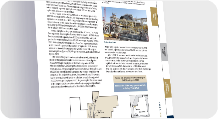 FRANCO-NEVADA CORPORATION 87 THE GOLD INVESTMENT THAT WORKS Tasiast Main Trend 2% NSR Royalty Boundar y TASIAST MAURITANIA MALI SENEGAL ALGERIA Original Royalty Area Tasiast Permit Area Plant Site Tasiast License Area, March 2012 Tasiast Mining License Tasiast Sud Gold Prospects Trends Resource/Reser ve Target Plant Site Tasiast Sud N Km 0 10 PRECIOUS METALS DIVERSIFIED ASSETS RESERVES AND RESOURCES ADDITIONAL INFORMATION 2021 2020 2019 Revenue to Franco-Nevada ($ million) $ 6.7 $ 14.3 $ 10.9 P&P Reserves (koz Au) 1 6,404 6,330 6,783 M&I Resource (koz Au) 1 8,992 9,083 9,417 Inferred Resource (koz Au) 1 971 267 353 P&P Royalty Ounces (000s) 2 128 127 136 M&I Royalty Ounces (000s) 1, 2 180 182 188 Inf Royalty Ounces (000s) 2 19 5 7 1 Please refer to the tables on pages 128-136 for a breakout of grade and tonnages by Mineral Resource category; all M&I categories are inclusive of Mineral Reserves 2 For Royalty Ounce calculation, Franco-Nevada estimates 100% of the Mineral Reserves and Mineral Resources are subject to our royalty interest and estimates a rate of 2.0% is applicable Tasiast Au Mauritania, Rest of World Operator: Kinross Gold Corporation Royalty: NSR: 2% Precious Metals Franco-Nevada has a 2% NSR royalty on the Tasiast project operated by Kinross. Kinross acquired control of Tasiast in September 2010 pursuant to its acquisition of Red Back Mining Inc. The royalty originally covered three large permit areas in Mauritania, West Africa which includes the Tasiast main trend and Tasiast Sud. The most prominent permit area is Tasiast, with a currently reported mining license area of 312 km 2 and a total exploration license area of 3,118 km 2 . In 2021, Tasiast produced 170,502 ounces of gold compared with 406,509 ounces in 2020, reflecting the temporary suspension of milling operations as a result of a mill fire in June 2021. Kinross reported that Tasiast returned to full production with throughput gradually ramping up during Q4 2021 and the mill reaching 19,000 to 20,000 tonnes per day in January 2022 on a sustained basis. Kinross is implementing a phased expansion of Tasiast. The Phase One expansion was completed during the third quarter of 2018. Phase One increased mill capacity from 8,000 tpd to 12,000 tpd with gold production expected to average 409,000 ounces per year over 2018 to 2027. At the time, Kinross planned a Phase Two expansion at Tasiast to increase mill capacity to 30,000 tpd. In September 2019, Kinross announced it would instead proceed with the Tasiast 24k project, increasing throughput to 21,000 tpd by year-end 2021 and 24,000 tpd by mid-2023. The Tasiast 24k project continues to advance well, with the first phase of the project scheduled to reach sustained throughput of 21,000 tonnes per day by the end of the first quarter of 2022. After the mill restart, 21,000 tpd has been achieved periodically in February 2022. The power plant started operations in the fourth quarter of 2021 and commissioning is ongoing at a number of facilities that are part of the project’s first phase. The second phase of the project is also progressing well and is on schedule to reach throughput of 24,000 tonnes per day by mid-2023. Engineering for the second phase of the project is 60% complete, with all major equipment purchased and construction of the site’s third leach tank 50% complete. Rest of World The project is expected to extend the mine life by four years to 2033 and Tasiast is expected to produce over 600,000 ounces of gold per annum over the next three years. In June 2020, Kinross announced that it had reached terms with the Government of Mauritania to enhance the partnership between the two parties. Under the terms of the agreement, a 30-year exploitation license for Tasiast Sud would be granted, among other items. In December 2019, Kinross signed a $300 million project financing for Tasiast with the IFC (a member of the World Bank Group), Export Development Canada, and two commercial banks. Tasiast 24k project on track to ramp-up to 24,000 tpd by mid-2023 Prospective 75 km long greenstone belt, including Tasiast Sud Tasiast, Mauritania