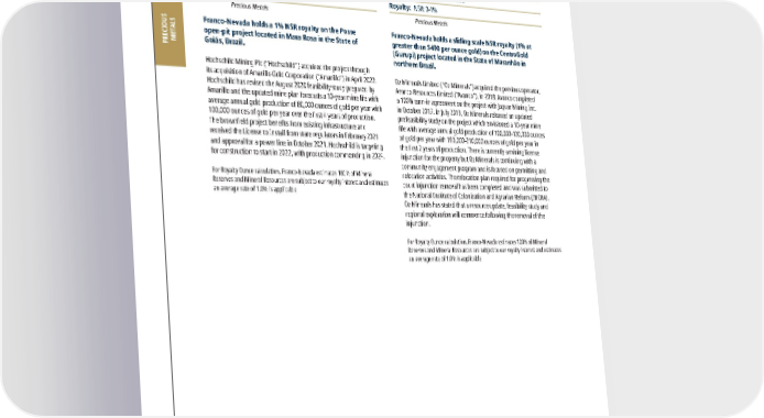 2022 ASSET HANDBOOK 46 FNV TSX NYSE Other South America Assets South America Precious Metals Please refer to the tables on pages 128-136 for a breakout of grade and tonnages by Mineral Resource category. Franco-Nevada holds a 1% NSR royalty on the Posse open-pit project located in Mara Rosa in the State of Goiás, Brazil. Hochschild Mining Plc (“Hochschild”) acquired the project through its acquisition of Amarillo Gold Corporation (“Amarillo”) in April 2022. Hochschild has revised the August 2020 feasibility study prepared by Amarillo and the updated mine plan forecasts a 10-year mine life with average annual gold production of 80,000 ounces of gold per year with 100,000 ounces of gold per year over the first 4 years of production. The brownfield project benefits from existing infrastructure and received the License to Install from state regulators in February 2021 and approval for a power line in October 2021. Hochschild is targeting for construction to start in 2022, with production commencing in 2024. For Royalty Ounce calculation, Franco-Nevada estimates 100% of Mineral Reserves and Mineral Resources are subject to our royalty interest and estimates an average rate of 1.0% is applicable Posse (Mara Rosa) Au Brazil, South America Operator: Hochschild Mining Plc Royalty: NSR: 1% Precious Metals Franco-Nevada holds a sliding scale NSR royalty (1% at greater than $400 per ounce gold) on the CentroGold (Gurupi) project located in the State of Maranhão in northern Brazil. Oz Minerals Limited (“Oz Minerals”) acquired the previous operator, Avanco Resources Limited (“Avanco”), in 2018. Avanco completed a 100% earn-in agreement on the project with Jaguar Mining Inc. in October 2017. In July 2019, Oz Minerals released an updated prefeasibility study on the project which envisioned a 10-year mine life with average annual gold production of 100,000-120,000 ounces of gold per year with 190,000-210,000 ounces of gold per year in the first 2 years of production. There is currently a mining license injunction for the property but Oz Minerals is continuing with a community engagement program and is focused on permitting and relocation activities. The relocation plan required for progressing the court injunction removal has been completed and was submitted to the National Institute of Colonization and Agrarian Reform (INCRA). Oz Minerals has stated that a resource update, feasibility study and regional exploration will commence following the removal of the injunction. For Royalty Ounce calculation, Franco-Nevada estimates 100% of Mineral Reserves and Mineral Resources are subject to our royalty interest and estimates an average rate of 1.0% is applicable CentroGold (Gurupi) Au Brazil, South America Operator: Oz Minerals Limited Royalty: NSR: 0-1% Precious Metals South America PRECIOUS METALS