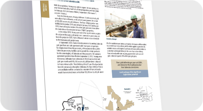 2022 ASSET HANDBOOK 86 FNV TSX NYSE N Kilometres 0 20 Sabodala 22.5 K oz/yr for 6 yrs; then 6% Stream Sabodala Concession OJVG Concession Deposits N Kilometres 0 2.5 10 kilometres from mill Mill OJVG Sabodala Sabodala West Golouma Deposits Masato Deposit Niakafiri Deposit Sabodala Pit Tailings Gora Deposit Senegal Mali Mauritania Sabodala Dakar Guinea Atlantic Ocean Atlantic Ocean SENEGAL MALI MAURITANIA GUINEA COTE D’IVOIRE LIBERIA SIERRA LEONE GAMBIA GUINEA-BISSAU Sabodala PRECIOUS METALS 2021 2020 2019 Revenue to Franco-Nevada ($ million) $ 16.7 $ 21.6 $ 29.5 P&P Reserves (koz Au) 1 4,796 2,190 2,190 M&I Resource (koz Au) 1 6,640 3,730 3,729 Inferred Resource (koz Au) 1 1,728 976 976 P&P Royalty Ounces (000s) 2 75 85 105 M&I Royalty Ounces (000s) 1, 2 112 159 179 Inf Royalty Ounces (000s) 2 35 47 47 1 Please refer to the tables on pages 128-136 for a breakout of grade and tonnages by Mineral Resource category; all M&I categories are inclusive of Mineral Reserves 2 In 2021, Franco-Nevada estimates that 42% of the remaining Mineral Reserves & Mineral Resources at the Sabodala-Massawa Complex are subject to a rate of 4.8% (6.0% gold stream which is factored by 80% to estimate equivalent Royalty Ounce rate). In 2020 and 2019, it was estimated that 100% of the Mineral Reserves & Mineral Resources at Sabodala only were subject to a rate of 4.8% Sabodala Au Senegal, Rest of World Operator: Endeavour Mining Corporation Stream: Fixed gold deliveries / 6% Gold Stream Precious Metals In December 2013, Franco-Nevada (Barbados) Corporation, a subsidiary of Franco-Nevada, provided Teranga Gold Corporation (“Teranga”) with a $135 million deposit to fund the acquisition by Teranga of additional future ore sources for its Sabodala mill. With the acquisition, Teranga was able to expand its land package to over 950 km 2 including much of a 70 km prospective greenstone belt. In February 2021, Endeavour Mining Corporation (“Endeavour”) acquired Teranga. Over the first six years, Teranga delivered 22,500 ounces of gold annually to Franco-Nevada, under a fixed arrangement, for a total of 135,000 ounces of gold delivered. The fixed delivery period was fulfilled in December 2019 and, between January 2020 and August 2020, Franco-Nevada received 6% of the gold produced from either the Sabodala or Oromin Joint Venture (“OJVG”) properties. In December 2019, Teranga announced an agreement to acquire the adjacent Massawa gold project and commenced processing ore from the project in 2020. Franco-Nevada’s stream does not extend to the Massawa gold project area. In September 2020, Franco-Nevada amended its existing Sabodala gold purchase and sale agreement with Teranga to compensate for displacement from the processing of Massawa ore through the Sabodala processing facilities and to provide for certain protocols for the commingling of Sabodala and Massawa ores. The amended agreement provides that effective September 1, 2020, Teranga, now Endeavour, will make fixed deliveries of 783.33 ounces of refined gold per month until 105,750 ounces of gold have been delivered to Franco-Nevada (the “Fixed Delivery Period”) and 6% of production from the stream area thereafter. Following the Fixed Delivery Period, a reconciliation will be conducted to determine if Franco-Nevada would have received more or less than 105,750 ounces of gold under Rest of World Fixed gold deliveries per year until 2031, and thereafter 6% of gold production from Sabodala concessions Land package offers significant exploration potential the 6% variable stream during such period. Endeavour will be entitled to a credit for an over-delivery which will be applied against the 6% variable stream until depleted and Franco-Nevada will be entitled to a one-time additional delivery in the case of an under-delivery. Franco-Nevada will make ongoing payments for each ounce of gold delivered equal to 20% of the spot gold price. Sabodala, Senegal