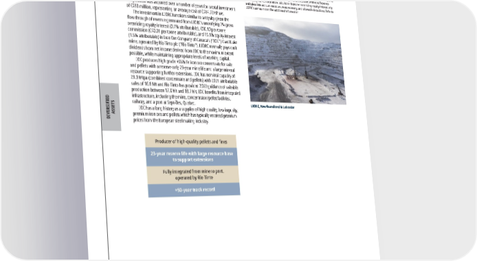 2022 ASSET HANDBOOK 106 FNV TSX NYSE DIVERSIFIED ASSETS LIORC Iron Ore Newfoundland & Labrador, Canada Operator: Rio Tinto plc Royalty: GORR 0.7% Iron Ore, IOC Equity 1.5% Diversified Franco-Nevada holds 6.3 million common shares (a 9.9% equity investment) in Labrador Iron Ore Royalty Corporation (“LIORC”). The position was acquired over a number of years for a total investment of C$93 million, representing an average cost of C$14.72/share. The investment in LIORC functions similar to a royalty given the flow through of revenue generated from LIORC’s underlying 7% gross overriding royalty interest (0.7% attributable), C$0.10 per tonne commission (C$0.01 per tonne attributable), and 15.1% equity inter est (1.5% attributable) in Iron Ore Company of Canada’s (“IOC”) Carol Lake mine, operated by Rio Tinto plc (“Rio Tinto”). LIORC normally pays cash dividends from net income derived from IOC to the maximum extent possible, while maintaining appropriate levels of working capital. IOC produces high grade +65% Fe iron ore concentrate for sale and pellets with a reserve-only 23-year mine life and a large mineral resource supporting further extensions. IOC has nominal capacity of 23.3 Mtpa (combined concentrate and pellets) with 2021 attributable sales of 16.8 Mt and Rio Tinto has provided 2022 guidance of saleable production between 17.0 Mt and 18.7 Mt. IOC benefits from integrated infrastructure, including the mine, concentrator/pellet facilities, railway, and a port at Sept-Îles, Quebec. IOC has a long history as a supplier of high quality, low impurity, premium iron ore and pellets which has typically received premium prices from the European steel making industry. Producer of high-quality pellets and fines 23-year reserve life with large resource base to support extensions Fully integrated from mine to port, operated by Rio Tinto +50-year track record Iron Ore 2021 Revenue to Franco-Nevada ($ million) $ 30.2 P&P Reserves (Tonnes 000s) 1,144,000 M&I Resource (Tonnes 000s) 1,930,000 Inferred Resource (Tonnes 000s) 895,000 P&P Royalty Ounces (000s) 2 207 M&I Royalty Ounces (000s) 1, 2 349 Inf Royalty Ounces (000s) 2 162 1 Please refer to the tables on pages 128-136 for a breakout of grade and tonnages by Mineral Resource category; all M&I categories are inclusive of Mineral Reserves 2 For Royalty Ounce calculation, calculation based on overriding royalty interest only and takes into account moisture, mass recovery, and allowable deductions. Refer to LIORC's annual report for additional information LIORC, Newfoundland & Labrador