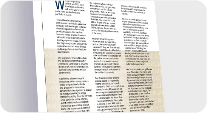 GOLD GOLD GOLD GOLD GOLD GOLD GOLD GOLD GOLD GOLD GOLD GOLD GOLD GOLD GOLD GOLD GOLD GOLD GOLD GOLD SILVER SILVER SILVER SILVER SILVER SILVER SILVER SILVER SILVER SILVER SILVER SILVER SILVER SILVER SILVER SILVER SILVER SILVER SILVER PLATINUM PLATINUM PLATINUM PLATINUM PLATINUM PLATINUM PLATINUM PLATINUM PLATINUM PLATINUM PLATINUM PLATINUM OIL NATURAL GAS NGLS OIL NATURAL GAS NGLS OIL NATURAL GAS NGLS OIL NATURAL GAS NGLS OIL NATURAL GAS NGLS OIL NATURAL IRON ORE IRON ORE IRON ORE IRON ORE IRON ORE IRON ORE IRON ORE IRON ORE IRON ORE IRON ORE IRON ORE IRON ORE GOLD GOLD GOLD GOLD GOLD GOLD GOLD GOLD GOLD GOLD GOLD GOLD GOLD GOLD GOLD GOLD GOLD GOLD GOLD GOLD SILVER SILVER SILVER SILVER SILVER SILVER SILVER SILVER SILVER SILVER SILVER SILVER SILVER SILVER SILVER SILVER SILVER SILVER SILVER PLATINUM PLATINUM PLATINUM PLATINUM PLATINUM PLATINUM PLATINUM PLATINUM PLATINUM PLATINUM PLATINUM PLATINUM IRON ORE IRON ORE IRON ORE IRON ORE IRON ORE IRON ORE IRON ORE IRON ORE IRON ORE IRON ORE IRON ORE IRON ORE GOLD GOLD GOLD GOLD GOLD GOLD GOLD GOLD GOLD GOLD GOLD GOLD GOLD GOLD GOLD GOLD GOLD GOLD GOLD GOLD SILVER SILVER SILVER SILVER SILVER SILVER SILVER SILVER SILVER SILVER SILVER SILVER SILVER SILVER SILVER SILVER SILVER SILVER SILVER PLATINUM PLATINUM PLATINUM PLATINUM PLATINUM PLATINUM PLATINUM PLATINUM PLATINUM PLATINUM PLATINUM PLATINUM GOLD GOLD GOLD GOLD GOLD GOLD GOLD GOLD GOLD GOLD GOLD GOLD GOLD GOLD GOLD GOLD GOLD GOLD GOLD GOLD SILVER SILVER SILVER SILVER SILVER SILVER SILVER SILVER SILVER SILVER SILVER SILVER SILVER SILVER SILVER SILVER SILVER SILVER SILVER PLATINUM PLATINUM PLATINUM PLATINUM PLATINUM PLATINUM PLATINUM PLATINUM PLATINUM PLATINUM PLATINUM PLATINUM OIL NATURAL GAS NGLS OIL NATURAL GAS NGLS OIL NATURAL GAS NGLS OIL NATURAL GAS NGLS OIL NATURAL GAS NGLS OIL NATURAL IRON ORE IRON ORE IRON ORE IRON ORE IRON ORE IRON ORE IRON ORE IRON ORE IRON ORE IRON ORE IRON ORE IRON ORE GOLD GOLD GOLD GOLD GOLD GOLD GOLD GOLD GOLD GOLD GOLD GOLD GOLD GOLD GOLD GOLD GOLD GOLD GOLD GOLD SILVER SILVER SILVER SILVER SILVER SILVER SILVER SILVER SILVER SILVER SILVER SILVER SILVER SILVER SILVER SILVER SILVER SILVER SILVER PLATINUM PLATINUM PLATINUM PLATINUM PLATINUM PLATINUM PLATINUM PLATINUM PLATINUM PLATINUM PLATINUM PLATINUM IRON ORE IRON ORE IRON ORE IRON ORE IRON ORE IRON ORE IRON ORE IRON ORE IRON ORE IRON ORE IRON ORE IRON ORE GOLD GOLD GOLD GOLD GOLD GOLD GOLD GOLD GOLD GOLD GOLD GOLD GOLD GOLD GOLD GOLD GOLD GOLD GOLD GOLD 2022 ASSET HANDBOOK 4 FNV TSX NYSE W e are delighted to publish our 2022 Asset Handbook and trust it will assist you to better understand our business and portfolio of assets. Franco-Nevada is the leading gold-focused royalty and streaming company with the largest and most diversified portfolio of cash flow producing assets. Our top line business model provides investors with gold price optionality while limiting exposure to cost inflation. Our high margins and exposure to exploration success have allowed us to outperform in both bull and bear markets. Our tag-line is “Franco-Nevada is the gold investment that works” and we are committed to ensuring it does work, for our shareholders, our operating partners and our communities. Combining a lower-risk gold investment with a strong balance sheet, progressive dividends and exposure to exploration optionality is the right mix to appeal to investors seeking to hedge market instability. Over the 14 years since our initial public offering, our shareholders have realized a share price appreciation of over 860% and a compounded annual growth rate of greater than 18%. Our objective is to sustain our dividend in almost any gold price environment and for it to be progressive. We have increased dividends for the fourteenth consecutive year and cumulative dividends now exceed US$1.73 billion. At year-end, our market capitalization exceeded US$26 billion, ranking Franco-Nevada among the largest gold companies in the world. We work to build long-term alignment with our operating partners, knowing we are only successful if they are. This win-win approach and the natural flexibility of royalties and streams has proven to be an effective financing tool for the cyclical resource sector. Our approach is to provide low-cost financing to the industry, to act as stable and supportive partners through the cycle and to share in the upside of a property. Our shareholders rely on us to allocate capital to responsible mining operations. As a result, attention to ESG is a core part of our transaction due diligence and we encourage our operators to adopt responsible operating principles as established by the World Gold Council or otherwise. Our goal is to achieve at least 40% diverse representation between the Board and senior management as a group by 2025 and we actively promote diversity and inclusion in our workforce. Our work with operators to develop and fund programs to benefit communities continues to expand. We have a unique approach to the royalty and streaming business that is born from experiencing many industry cycles. We avoid long-term debt to ensure strong capital availability at all times. Our Board and management have some of the best technical skills in the industry as evidenced by their success in asset selection. We are significant owners of the Company which is essential to our “thinking like owners”, keeping G&A low and treating shareholder funds as our own. Our investment objective is to increase our net asset value and cash flow per share, not just to make the Company larger. Our focus is growing our gold expo - sure. This includes financing gold mines and acquiring gold royalties, but increasingly through acquiring by-product precious metal streams from base metal mines. When good opportunities present themselves, we also invest in other resources outside of precious metals. This strategy adds to our cash flow growth, asset diversity and exposure to resource sector optionality. We don’t control when good assets