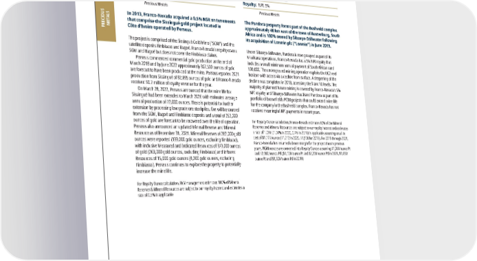 2022 ASSET HANDBOOK 94 FNV TSX NYSE PRECIOUS METALS Rest of World Other Rest of World Assets Rest of World Precious Metals Please refer to the tables on pages 128-136 for a breakout of grade and tonnages by Mineral Resource category. In 2013, Franco-Nevada acquired a 0.5% NSR on tenements that comprise the Sissingué gold project located in Côte d’Ivoire operated by Perseus. The project is comprised of the Sissingué Gold Mine (“SGM”) and the satellite deposits Fimbiasso and Bagoé. Franco-Nevada’s royalty covers SGM and Bagoé but does not cover the Fimbiasso claims. Perseus commenced commercial gold production at the end of March 2018 and by June 2022 approximately 367,500 ounces of gold are forecast to have been produced at the mine. Perseus reported 2021 production from Sissingué of 82,895 ounces of gold and Franco-Nevada received $0.7 million of royalty revenue for the year. On March 28, 2022, Perseus announced that the mine life for Sissingué had been extended to March 2026 with estimated average annual production of 72,000 ounces. There is potential for further extension by processing low grade ore stockpiles. Ore will be sourced from the SGM, Bagoé and Fimbiasso deposits and a total of 252,000 ounces of gold are forecast to be recovered over the life of operation. Perseus also announced an updated Mineral Reserve and Mineral Resource as of December 31, 2021. Mineral Reserves of 282,000 gold ounces were reported (199,000 gold ounces, excluding Fimbiasso), with inclusive Measured and Indicated Resources of 379,000 ounces of gold (263,000 gold ounces, excluding Fimbiasso) and Inferred Resources of 15,000 gold ounces (8,000 gold ounces, excluding Fimbiasso). Perseus continues to explore the property to potentially increase the mine life. For Royalty Ounce calculation, FNV management estimates 100% of Mineral Reserves & Mineral Resources are subject to our royalty interest and estimates a rate of 0.5% is applicable Sissingué Au Côte d’Ivoire, Rest of World Operator: Perseus Mining Limited Royalty: NSR: 0.5% Precious Metals The Pandora property forms part of the Bushveld complex approximately 40 km east of the town of Rustenburg, South Africa and is 100% owned by Sibanye-Stillwater following its acquisition of Lonmin plc (“Lonmin”) in June 2019. Under Sibanye-Stillwater, Pandora is now grouped as part of its Marikana operations. Franco-Nevada has a 5% NPI royalty that includes a small minimum annual payment of South African rand 100,000. The underground mining operation exploits the UG2 reef horizon with access via a decline from surface. A deepening of the decline was completed in 2013, accessing the 9 and 10 levels. The majority of planned future mining is covered by Franco-Nevada’s 5% NPI royalty and Sibanye-Stillwater has listed Pandora as part of its portfolio of brownfields PGM projects that could extend mine life for the company in the Bushveld complex. Franco-Nevada has not received meaningful NPI payments in recent years. For Royalty Ounce calculation, Franco-Nevada estimates 80% of the Mineral Reserves and Mineral Resources are subject to our royalty interest and estimates a rate of 1.03% (1.04% in 2020, 0.7% in 2019) is applicable assuming an all in cost of $1,199/ounce ($1,212 in 2020, $1,100 for 2019). For 2019 thr ough 2021, Franco-Nevada has assumed a lower margin for the project than in previous years. PGM ounces are converted into Royalty Ounces assuming $1,000/ounce Pt and $2,100/ounce Pd ($1,100/ounce Pt and $2,200/ounce Pd in 2020, $1,050/ ounce Pt and $1,300/ounce Pd in 2019) Pandora PGM South Africa, Rest of World Operator: Sibanye-Stillwater Royalty: NPI: 5% Precious Metals