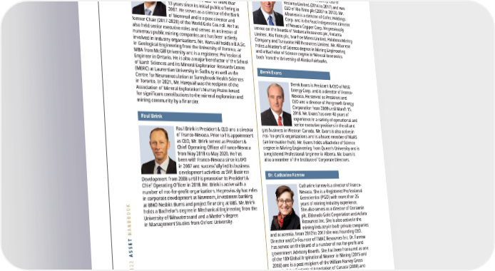 142 FNV TSX NYSE David Harquail David Harquail is Chair of the Board. Mr. Harquail was the founding CEO of the Corporation. Prior to his appointment as Chair in May 2020, Mr. Harquail served as the Corporation’s CEO for more than 13 years since its initial public offering in 2007. He serves as a director of the Bank of Montreal and is a past director and former Chair (2017-2020) of the World Gold Council. He has also held senior executive roles and served as a director of numerous public mining companies and has been actively involved in industry organizations. Mr. Harquail holds a B.A.Sc. in Geological Engineering from the University of Toronto, an MBA from McGill University and is a registered Professional Engineer in Ontario. He is also a major benefactor of the School of Earth Sciences and its Mineral Exploration Research Centre (MERC) at Laurentian University in Sudbury as well as the Centre for Neuromodulation at Sunnybrook Health Sciences in Toronto. In 2021, Mr. Harquail was the recipient of the Association of Mineral Exploration’s Murray Pezim Award for significant contributions to the mineral exploration and mining community by a financier. Paul Brink Paul Brink is President & CEO and a director of Franco-Nevada. Prior to his appointment as CEO, Mr. Brink served as President & Chief Operating Officer of Franco-Nevada from May 2018 to May 2020. He has been with Franco-Nevada since its IPO in 2007 and successfully led its business development activities as SVP, Business Development from 2008 until his promotion to President & Chief Operating Officer in 2018. Mr. Brink is active with a number of not-for-profit organizations. He previously had roles in corporate development at Newmont, investment banking at BMO Nesbitt Burns and project financing at UBS. Mr. Brink holds a Bachelor’s degree in Mechanical Engineering from the University of Witwatersrand and a Master’s degree in Management Studies from Oxford University. Tom Albanese Tom Albanese is a director of Franco- Nevada. He served as CEO of Vedanta Resources plc (2014 to 2017), CEO of Vedanta Limited (2014 to 2017) and was CEO of Rio Tinto plc (2007 to 2013). Mr. Albanese is a director of CoTec Holdings Corp. and is the lead independent director of Nevada Copper Corp. He previously served on the boards of Vedanta Resources plc, Vedanta Limited, Rio Tinto plc, Ivanhoe Mines Limited, Palabora Mining Company and Turquoise Hill Resources Limited. Mr. Albanese holds a Master’s of Science degree in Mining Engineering and a Bachelor of Science degree in Mineral Economics both from the University of Alaska Fairbanks. Derek Evans Derek Evans is President & CEO of MEG Energy Corp. and is a director of Franco- Nevada. He served as President and CEO and a director of Pengrowth Energy Corporation from 2009 until March 15, 2018. Mr. Evans has over 40 years of experience in a variety of operational and senior executive positions in the oil and gas business in Western Canada. Mr. Evans is also active in not-for-profit organizations and is a board member of MaRS (an innovation hub). Mr. Evans holds a Bachelor of Science degree in Mining Engineering from Queen’s University and is a registered Professional Engineer in Alberta. Mr. Evans is also a member of the Institute of Corporate Directors. Dr. Catharine Farrow Catharine Farrow is a director of Franco- Nevada. She is a Registered Professional Geoscientist (PGO) with more than 26 years of mining industry experience. She also serves as a director of Centamin plc, Eldorado Gold Corporation and Aclara Resources Inc. She is also active in the mining industry in both private companies and academia. From 2012 to 2017 she was Founding CEO, Director and Co-Founder of TMAC Resources Inc. Dr. Farrow has served on the Board of a number of not-for-profit and government Advisory Boards. She has been honoured as one of the 100 Global Inspirational Women in Mining (2015 and 2018) and is a past recipient of the William Harvey Gross Medal of the Geological Association of Canada (2000) and the Distinguished Alumni Award from the Acadia Alumni Association (2020). Dr. Farrow obtained her BSc (Hons) from Mount Allison University, her MSc from Acadia University and her PhD from Carleton University. She also holds the ICD.D designation. BOARD OF DIRECTORS Additional Information ADDITIONAL INFORMATION 2022 ASSET HANDBOOK