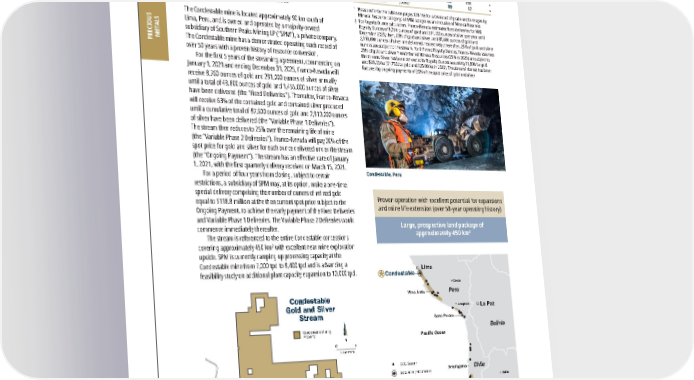 2022 ASSET HANDBOOK 42 FNV TSX NYSE Santiago Antofagasta Arequipa Cusco Mina Justa Cerro Pelado Santo Domingo Teresa de Colm’o Punta del Cobre Mantoverde El Espino Panulcillo IOCG Deposit Lima La Paz Salta N 0 250 Kilometers Condestable Candelaria Cretaceous IOCG Belt IOCG Mine (FNV Stream) Pacific Ocean Bolivia Argentina Chile Peru Condestable UG Surface Facilities Raul UG Vinchos UG Pacific Ocean N 0 5 Kilometers Condestable Gold and Silver Stream Condestable Mining Property 102 km to Lima Pan American Hwy On March 8, 2021, Franco-Nevada (Barbados) Corporation, a subsidiary of Franco-Nevada, closed a precious metals stream on production from the Condestable mine in Peru, for an up-front deposit of $165 million. The Condestable mine is located approximately 90 km south of Lima, Peru, and is owned and operated by a majority-owned subsidiary of Southern Peaks Mining LP (“SPM”), a private company . The Condestable mine has a demonstrated operating track record of over 50 years with a proven history of resource conversion. For the first 5 years of the streaming agreement, commencing on January 1, 2021 and ending December 31, 2025, Franco-Nevada will receive 8,760 ounces of gold and 291,000 ounces of silver annually until a total of 43,800 ounces of gold and 1,455,000 ounces of silver have been delivered (the “Fixed Deliveries”). Thereafter, Franco-Nevada will receive 63% of the contained gold and contained silver produced until a cumulative total of 87,600 ounces of gold and 2,910,000 ounces of silver have been delivered (the “Variable Phase 1 Deliveries”). The stream then reduces to 25% over the remaining life of mine (the “Variable Phase 2 Deliveries”). Franco-Nevada will pay 20% of the spot price for gold and silver for each ounce delivered under the stream (the “Ongoing Payment”). The stream has an effective date of January 1, 2021, with the first quarterly delivery received on March 15, 2021. For a period of four years from closing, subject to certain restrictions, a subsidiary of SPM may, at its option, make a one-time special delivery comprising the number of ounces of refined gold equal to $118.8 million at the then current spot price subject to the Ongoing Payment, to achieve the early payment of the Fixed Deliveries and Variable Phase 1 Deliveries. The Variable Phase 2 Deliveries would commence immediately thereafter. The stream is referenced to the entire Condestable concessions covering approximately 450 km 2 with excellent near mine exploration upside. SPM is currently ramping up processing capacity at the Condestable mine from 7,000 tpd to 8,400 tpd and is advancing a feasibility study on additional plant capacity expansion to 10,000 tpd. 2021 2020 2019 Revenue to Franco-Nevada ($ million) $ 22.5 $ – $ – P&P Reserves (koz Au) 1 170 n/a – M&I Resource (koz Au) 1 701 711 – Inferred Resource (koz Au) 1 480 481 – P&P Reserves (moz Ag) 1 5.2 n/a – M&I Resource (moz Ag) 1 17.6 17.9 – Inferred Resource (moz Ag) 1 12.3 12.3 – P&P Royalty Ounces (000s) 2 n/a n/a – M&I Royalty Ounces (000s) 1, 2 180 188 – Inf Royalty Ounces (000s) 2 89 92 – 1 Please refer to the tables on pages 128-136 for a breakout of grade and tonnages by Mineral Resource category; all M&I categories are inclusive of Mineral Reserves 2 For Royalty Ounce calculation, Franco-Nevada estimates fixed deliveries for M&I Royalty Ounces of 8,760 ounces of gold and 291,000 ounces of silver per year until December 2025; then, 63% of gold and silver until 87,600 ounces of gold and 2,910,000 ounces of silver are delivered, respectively; thereafter, 25% of gold and silver ounces are subject to the stream. For Inferred Royalty Ounces, Franco-Nevada assumes 25% of gold and silver from Inferred Mineral Resources (25% in 2020) are subject to the stream. Silver has been converted to Royalty Ounces assuming $1,800/oz gold and $23.00/oz ($1,750/oz gold and $25.00/oz in 2020). The stream interest has been factored by ongoing payments of 20% of the spot price of gold and silver Condestable Au & Ag Peru, South America Operator: Southern Peaks Mining LP Stream: Gold and Silver Stream Precious Metals Proven operation with excellent potential for expansions and mine life extension (over 50-year operating history) Large, prospective land package of approximately 450 km 2 Santiago Antofagasta Arequipa Cusco Mina Justa Cerro Pelado Santo Domingo Teresa de Colm’o Punta del Cobre Mantoverde El Espino Panulcillo IOCG Deposit Lima La Paz Salta N 0 250 Kilometers Condestable Candelaria Cretaceous IOCG Belt IOCG Mine (FNV Stream) Pacific Ocean Bolivia Argentina Chile Peru Condestable UG Surface Facilities Raul UG Vinchos UG Pacific Ocean N 0 5 Kilometers Condestable Gold and Silver Stream Condestable Mining Property 102 km to Lima Pan American Hwy South America PRECIOUS METALS Condestable, Peru