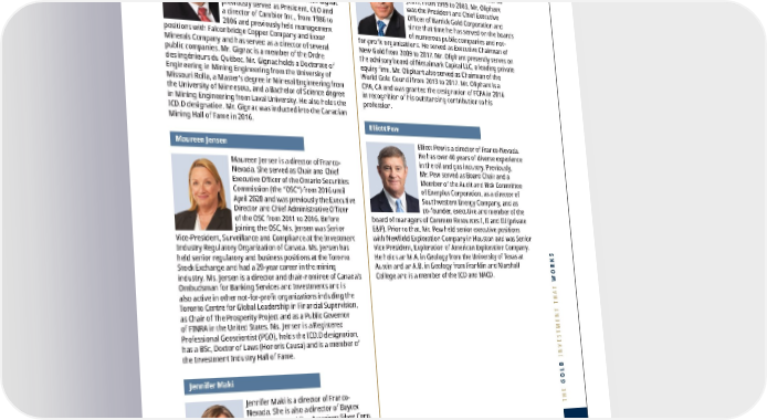FRANCO-NEVADA CORPORATION 143 Additional Information Louis Gignac Louis Gignac is Chair of G Mining Ventures Corp. (a public mining exploration and development company) and of G Mining Services Inc. (a private consultancy) and is a director of Franco-Nevada. Mr. Gignac previously served as President, CEO and a director of Cambior Inc., from 1986 to 2006 and previously held management positions with Falconbridge Copper Company and Exxon Minerals Company and has served as a director of several public companies. Mr. Gignac is a member of the Ordre des ingénieurs du Québec. Mr. Gignac holds a Doctorate of Engineering in Mining Engineering from the University of Missouri Rolla, a Master’s degree in Mineral Engineering from the University of Minnesota, and a Bachelor of Science degree in Mining Engineering from Laval University. He also holds the ICD.D designation. Mr. Gignac was inducted into the Canadian Mining Hall of Fame in 2016. Maureen Jensen Maureen Jensen is a director of Franco- Nevada. She served as Chair and Chief Executive Officer of the Ontario Securities Commission (the “OSC”) from 2016 until April 2020 and was previously the Executive Director and Chief Administrative Officer of the OSC from 2011 to 2016. Before joining the OSC, Ms. Jensen was Senior Vice-President, Surveillance and Compliance at the Investment Industry Regulatory Organization of Canada. Ms. Jensen has held senior regulatory and business positions at the Toronto Stock Exchange and had a 20-year career in the mining industry. Ms. Jensen is a director and chair-nominee of Canada’s Ombudsman for Banking Services and Investments and is also active in other not-for-profit organizations including the Toronto Centre for Global Leadership in Financial Supervision, as Chair of The Prosperity Project and as a Public Governor of FINRA in the United States. Ms. Jensen is a Registered Professional Geoscientist (PGO), holds the ICD.D designation, has a BSc, Doctor of Laws (Honoris Causa) and is a member of the Investment Industry Hall of Fame. Jennifer Maki Jennifer Maki is a director of Franco- Nevada. She is also a director of Baytex Energy Corp. and Pan American Silver Corp. She previously served as Chief Executive Officer of Vale Canada and Executive Director of Vale Base Metals (2014 to 2017) and previously held several other positions with Vale Base Metals, including Chief Financial Officer & Executive Vice-President and Vice-President & Treasurer. She has also served on the boards of not-for-profit organizations. Ms. Maki has a Bachelor of Commerce degree from Queen’s University and a postgraduate diploma from the Institute of Chartered Accountants, both in Ontario, Canada. She also holds the ICD.D designation. Randall Oliphant Randall Oliphant is a director of Franco- Nevada. He has worked in natural resources in many capacities for over 30 years. From 1999 to 2003, Mr. Oliphant was the President and Chief Executive Officer of Barrick Gold Corporation and since that time he has served on the boards of numerous public companies and not- for-profit organizations. He served as Executive Chairman of New Gold from 2009 to 2017. Mr. Oliphant presently serves on the advisory board of Metalmark Capital LLC, a leading private equity firm. Mr. Oliphant also served as Chairman of the World Gold Council from 2013 to 2017. Mr. Oliphant is a CPA, CA and was granted the designation of FCPA in 2016 in recognition of his outstanding contribution to his profession. Elliott Pew Elliott Pew is a director of Franco-Nevada. He has over 40 years of diverse experience in the oil and gas industry. Previously, Mr. Pew served as Board Chair and a Member of the Audit and Risk Committee of Enerplus Corporation, as a director of Southwestern Energy Company, and as co-founder, executive and member of the board of managers of Common Resources I, II and III (private E&P). Prior to that, Mr. Pew held senior executive positions with Newfield Exploration Company in Houston and was Senior Vice President, Exploration of American Exploration Company. He holds an M.A. in Geology from the University of Texas at Austin and an A.B. in Geology from Franklin and Marshall College and is a member of the ICD and NACD. ADDITIONAL INFORMATION THE GOLD INVESTMENT THAT WORKS