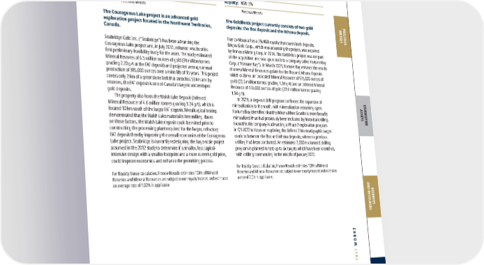 FRANCO-NEVADA CORPORATION 81 THE GOLD INVESTMENT THAT WORKS PRECIOUS METALS DIVERSIFIED ASSETS RESERVES AND RESOURCES ADDITIONAL INFORMATION Canada The Courageous Lake project is an advanced gold exploration project located in the Northwest Territories, Canada. Seabridge Gold Inc. (“Seabridge”) has been advancing the Courageous Lake project and, in July 2012, released results of its first preliminary feasibility study for the asset. The study estimated Mineral Reserves of 6.5 million ounces of gold (91 million tonnes grading 2.20 g/t at the FAT deposit) and projected average annual production of 385,000 ounces over a mine life of 15 years. This project covers only 2 km of a greenstone belt that stretches 53 km and by reserves, the FAT deposit is one of Canada’s largest undeveloped gold deposits. The property also hosts the Walsh Lake Deposit (Inferred Mineral Resource of 4.6 million tonnes grading 3.24 g/t), which is located 10 km south of the larger FAT deposit. Metallurgical testing demonstrated that the Walsh Lake material is free milling. Based on these factors, the Walsh Lake deposit could be mined prior to constructing the processing plant required for the larger, refractory FAT deposit thereby improving the overall economics of the Courageous Lake project. Seabridge is currently redesigning the large-scale project assumed in the 2012 study to determine if a smaller, less capital- intensive design with a smaller footprint and a more current gold price, could improve economics and enhance the permitting process. For Royalty Ounce calculation, Franco-Nevada estimates 100% of Mineral Reserves and Mineral Resources are subject to our royalty interest and estimates an average rate of 1.02% is applicable Courageous Lake Au Northwest Territories, Canada Operator: Seabridge Gold Inc. Royalty: NSR: 1.02% Precious Metals Other Canada Assets Canada Precious Metals Please refer to the tables on pages 128-136 for a breakout of grade and tonnages by Mineral Resource category. The Goldfields project currently consists of two gold deposits: the Box deposit and the Athona deposit. Franco-Nevada has a 2% NSR royalty that covers both deposits. Brigus Gold Corp., which was advancing the project, was acquired by Primero Mining Corp. in 2014. The Goldfields project was not part of the acquisition and was spun out into a company called Fortune Bay Corp. (“Fortune Bay”). In March 2021, Fortune Bay released the results of a new Mineral Resource update for the Box and Athona deposits which outlined an Indicated Mineral Resource of 975,000 ounces of gold (22.6 million tonnes grading 1.34 g/t) and an Inferred Mineral Resource of 176,000 ounces of gold (22.6 million tonnes grading 1.34 g/t). In 2021, a step-out drill program confirmed the expansion of mineralization to the south, with mineralization remaining open. Fortune Bay identified that the Athona Mine Granite is more broadly mineralized than had previously been indicated by historical drilling. From this the company is advancing a Phase 2 exploration program in Q1 2022 to focus on exploring the defined 2 km stratigraphic target corridor between the Box and Athona deposits, where no previous drilling had been conducted. An estimated 2,000 m diamond drilling program is planned to test up to six targets which have been identified, with drilling commencing in the middle of January 2022. For Royalty Ounce calculation, Franco-Nevada estimates 100% of Mineral Reserves and Mineral Resources are subject to our royalty interest and estimates a rate of 2.0% is applicable. Goldfields Au Saskatchewan, Canada Operator: Fortune Bay Corp. Royalty: NSR: 2% Precious Metals